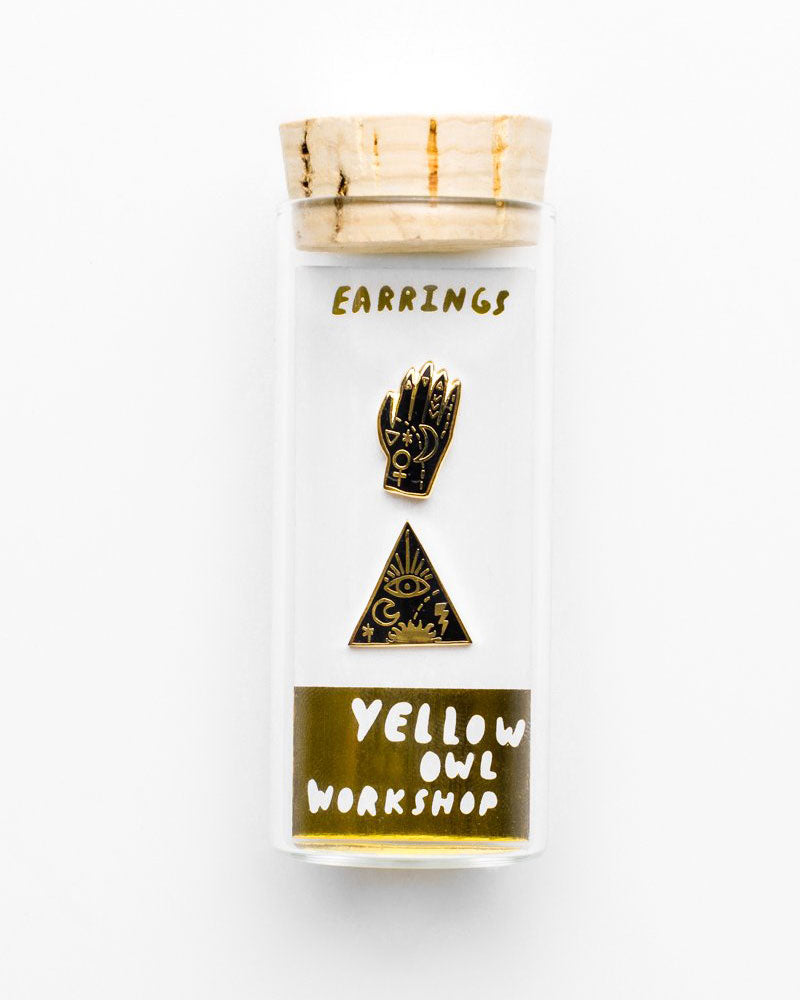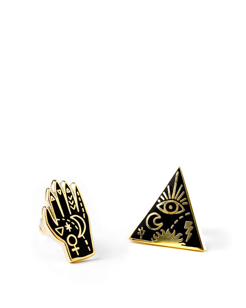 These mismatched earrings are perfectly paired. Featuring mystical, magical symbols of the occult, this magic hand and ancient pyramid will unlock forces from the other world. (Or... they may just make you look cool.)