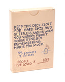 Keep this deck close for hard days and sleepless nights, when you worry about forgetting but remembering hurts too much. A comforting anecdote to pass the time when in grief and sadness, useful when alone or even with loved ones.