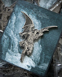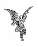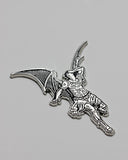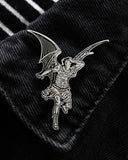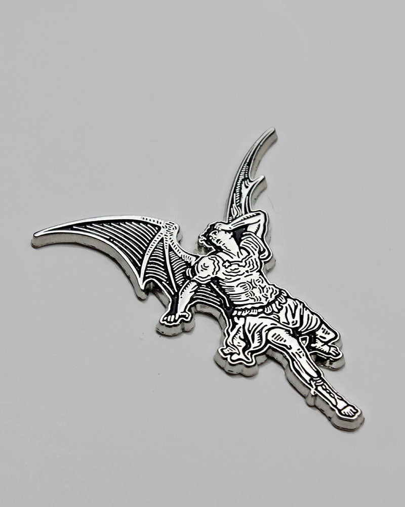 This large pin is inspired by one of Gustave Doré's famous illustrations done for Milton's “Paradise Lost” featuring a winged Lucifer, fallen from grace. The art history pin even comes on a backing card featuring work from the original illustration.