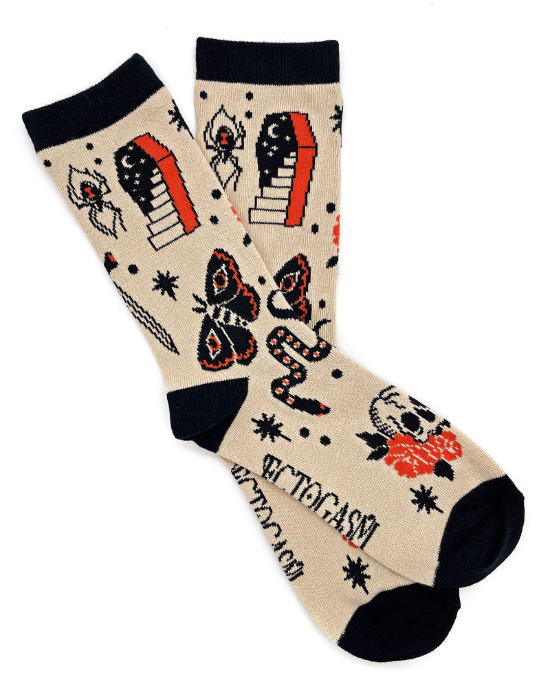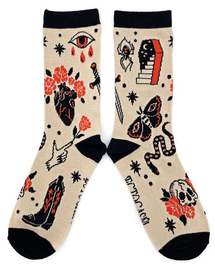 A collage of spooky and gloomy artwork in the vein of a tattoo flash.