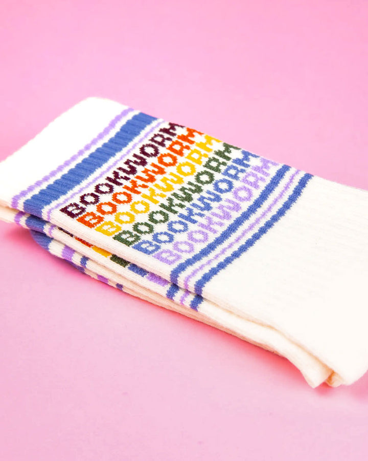 Estos calcetines con motivos de gusanos de biblioteca de colores del arco iris recuerdan a los calcetines de gimnasia de la escuela secundaria y son perfectos para aquellos que pasaron todo el tiempo en la biblioteca de la escuela.