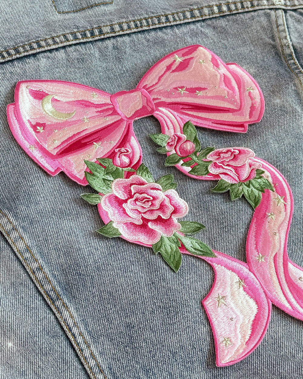 Súper femenino y súper lindo. Este gran lazo rosa fluido está acompañado de flores rosas florecientes y adornado con estrellas plateadas y una luna creciente. Es el toque botánico coqueto perfecto, diseñado para adornar perfectamente la parte trasera de chaquetas o incluso un atuendo de cosplay más grande.
