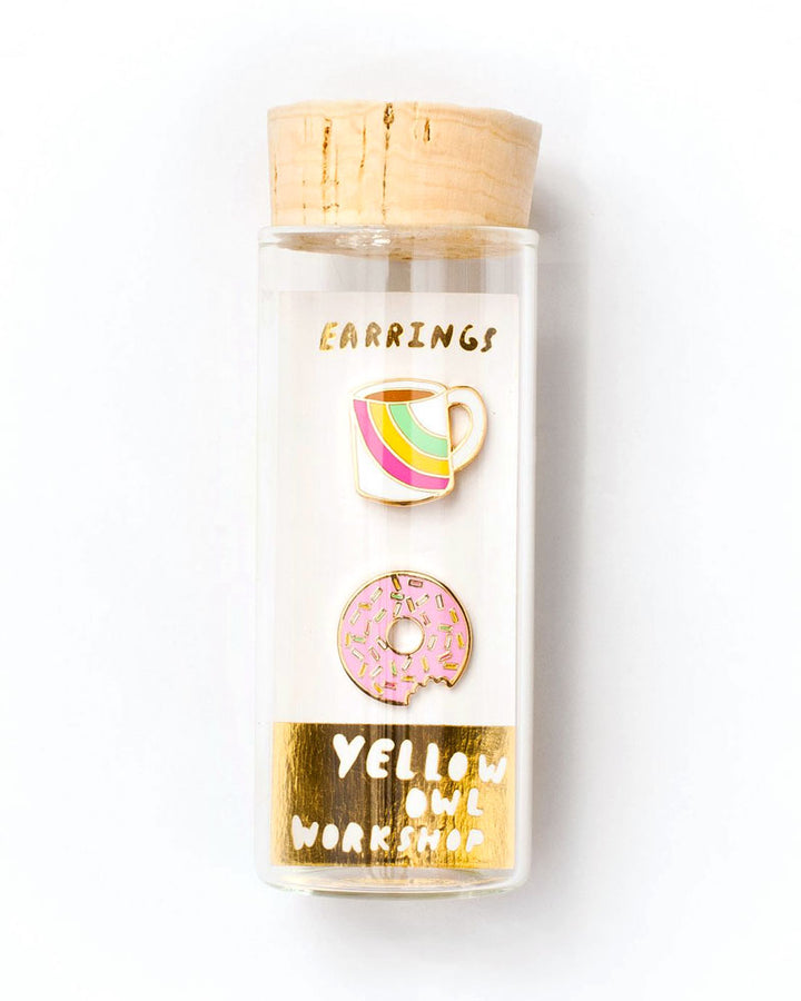 Estos pendientes desiguales combinan a la perfección. ¿Qué mejor que un café y unas donas para desayunar? (Preferiblemente con chispitas y una taza de arcoíris).