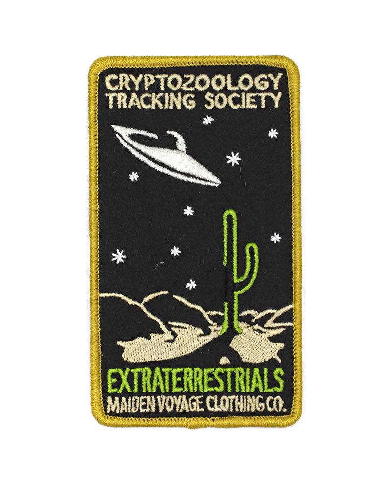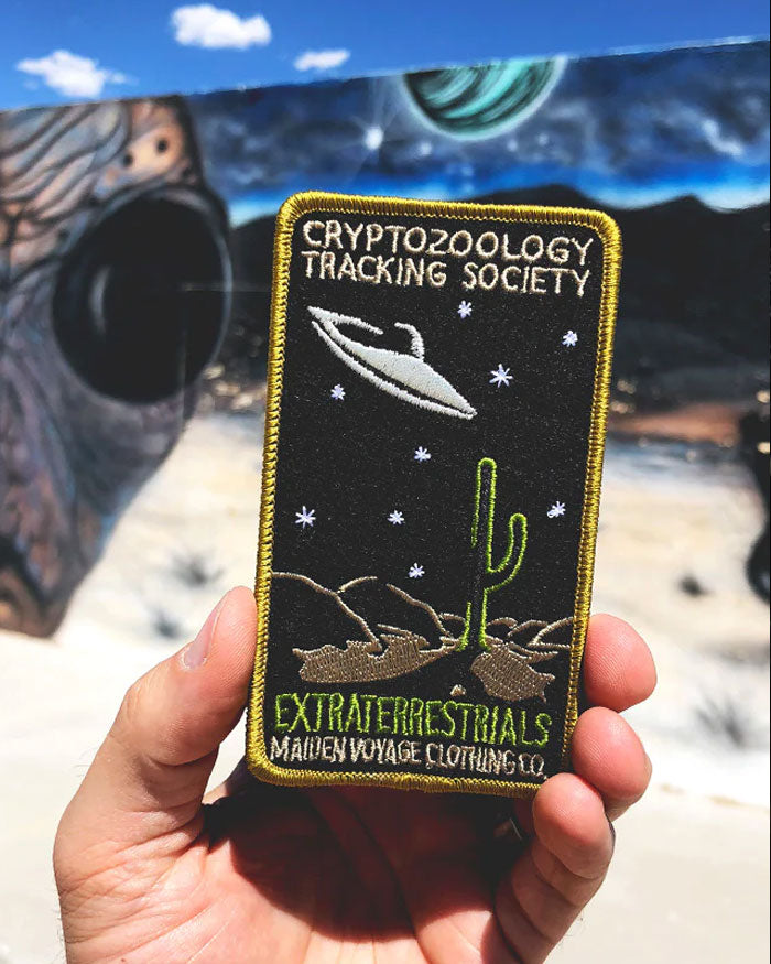 Los parches de Cryptozoology Tracking Society recuerdan a los parches antiguos de los parques nacionales, pero cada uno presenta un personaje críptido diferente en su hábitat natural. Este diseño trata sobre el folclore de los extraterrestres, como los platillos voladores .