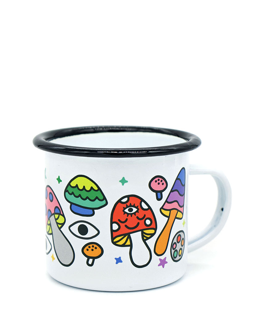 Esta taza está cubierta de hongos alegres, coloridos y brillantes. ¡Qué divertido! Perfecto para acampar, una cabaña o el hogar.