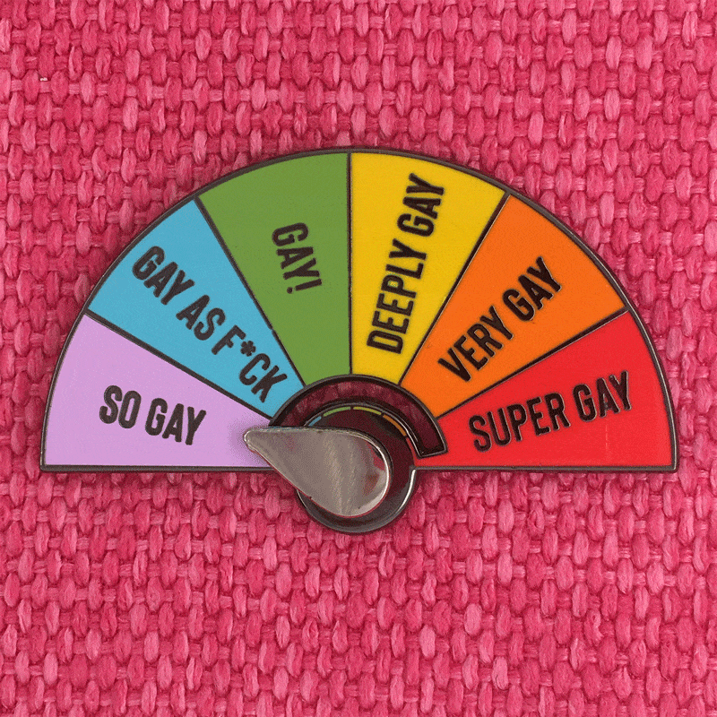 ¿Qué tan gay te sientes? ¿Es hora de subir de nivel? En este medidor de arcoíris se representan los siguientes atributos: gay, gay AF, gay!, profundamente gay, muy gay y súper gay. Mueve la flecha para señalarlo a las personas.