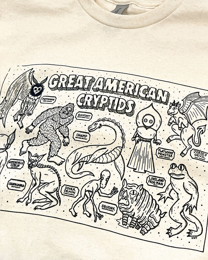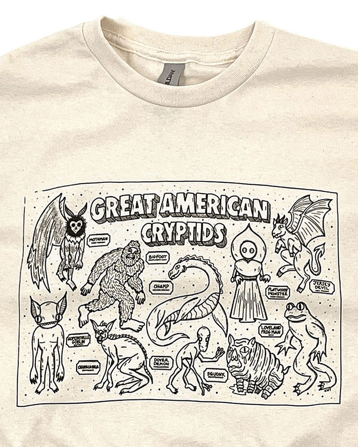Para cualquier amante de los críptidos y de la tradición, esta camiseta del artista presenta a todos los grandes, ¡además de algunos de los que quizás no hayas oído hablar! Mothman, Bigfoot, Chupacabra, Dover Demon, Hopkinsville Goblin, Champ, Flatwood Monster, Squonk, Jersey Devil y Loveland Frogman están todos ilustrados con detalles únicos por el artista.