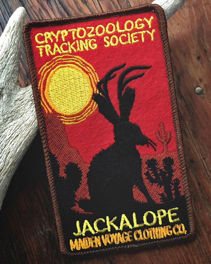 Los parches de Cryptozoology Tracking Society recuerdan a los parches antiguos de los parques nacionales, pero cada uno presenta un personaje críptido diferente en su hábitat natural. Este diseño trata sobre el folclore del Jackalope .