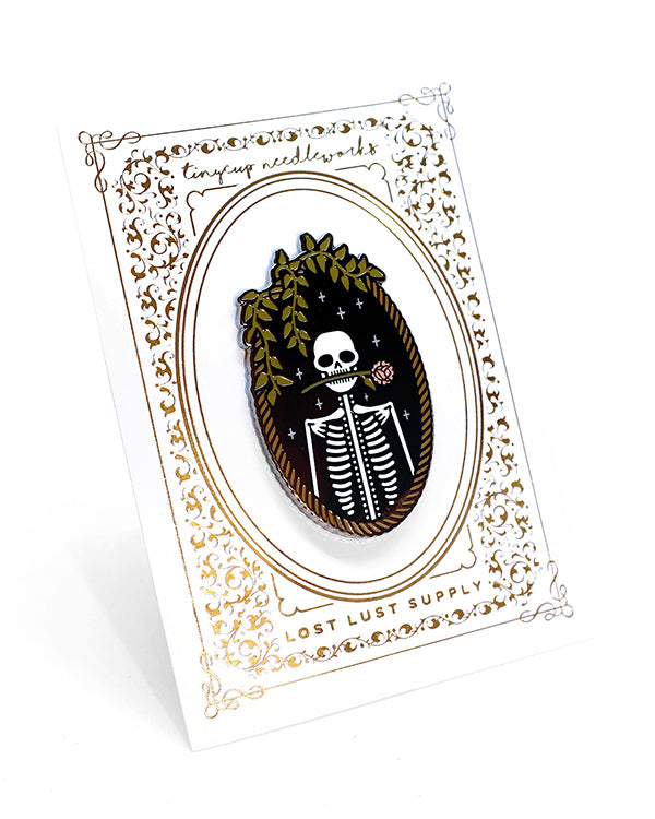Una rosa para los muertos, un broche con forma de esqueleto para llevar contigo durante tus horas de vigilia.