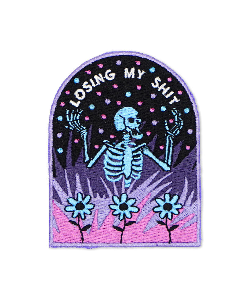 ¡Estoy completamente loca! Levanto las manos al aire. Una divertida yuxtaposición de color y brillo con muerte y desesperación en este parche de chaqueta único.
