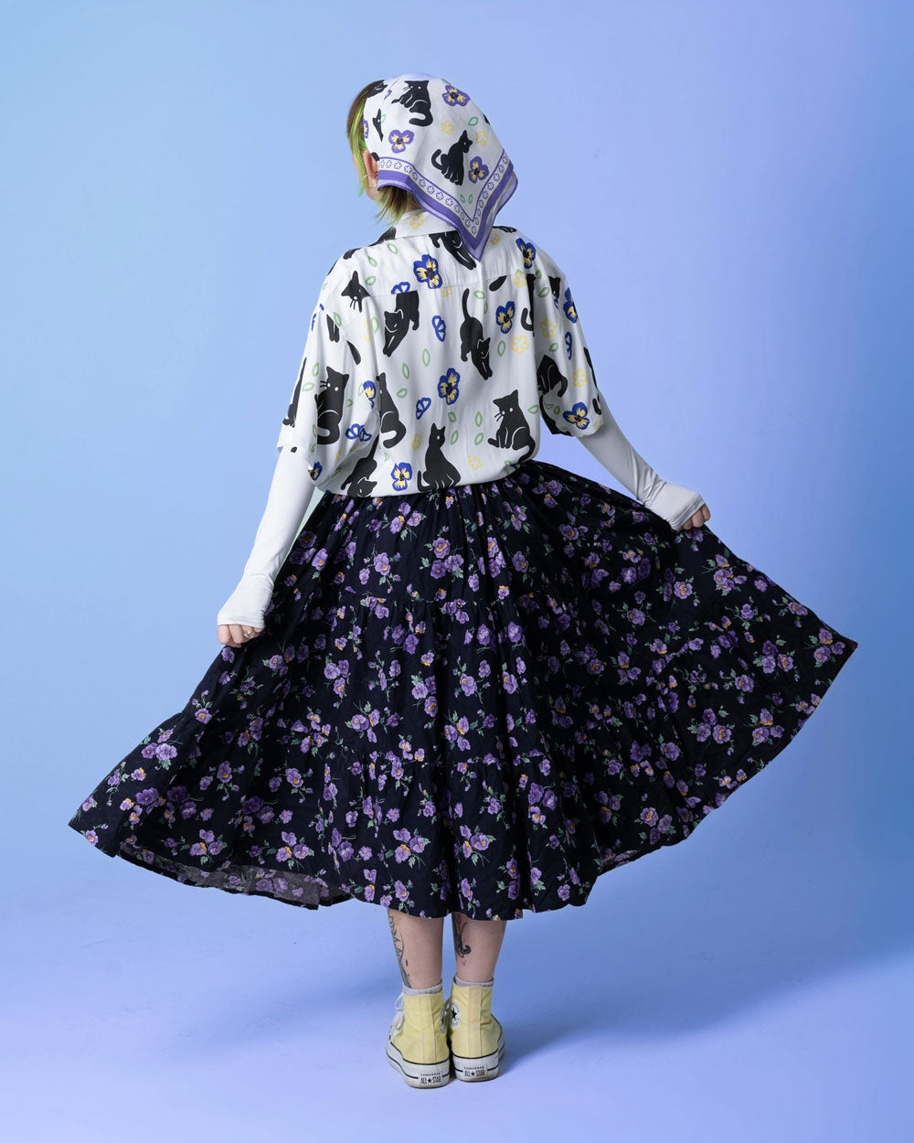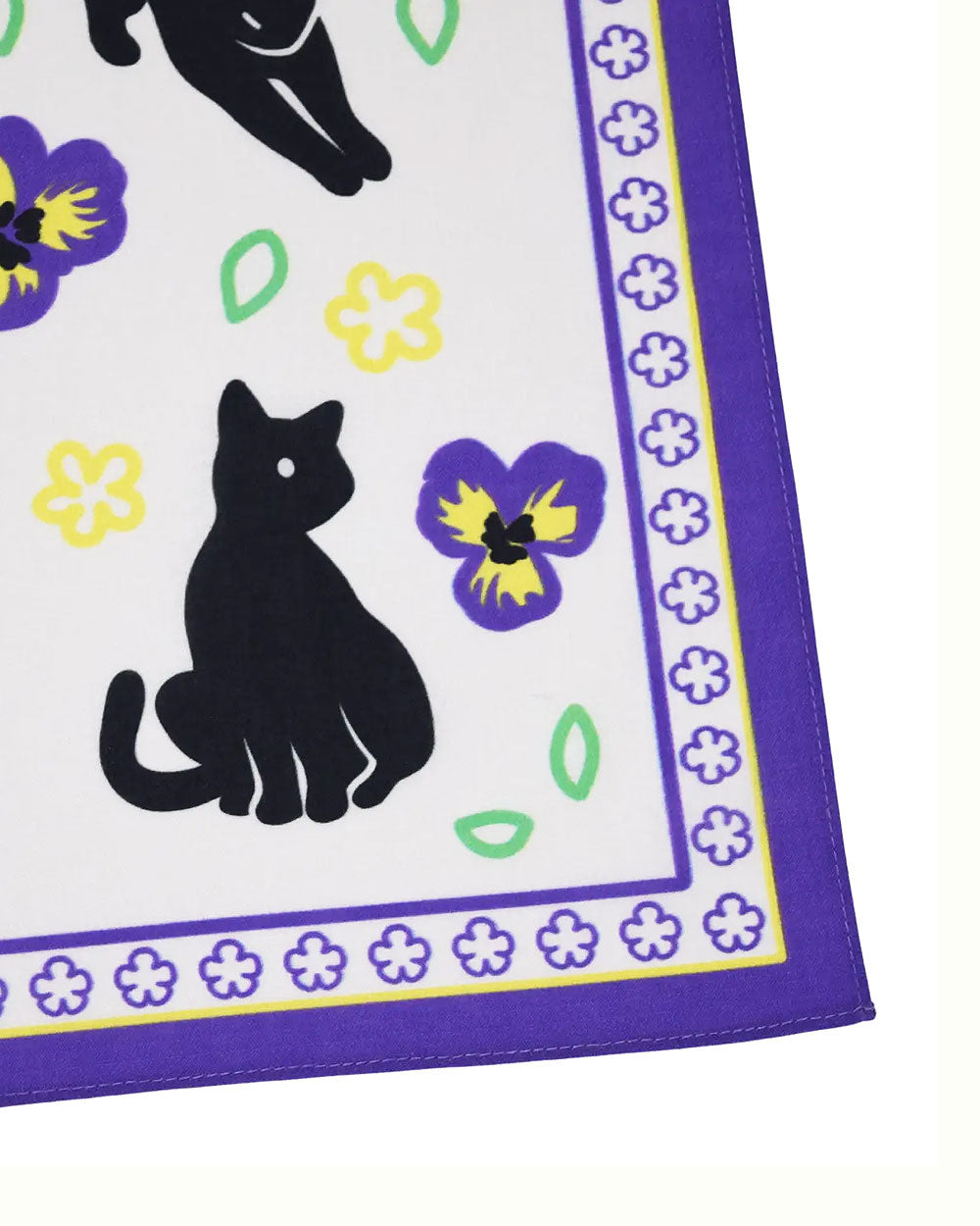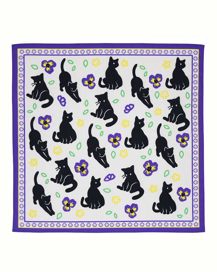 These black cats are just hangin around amongst the paisleys. Flowers and felines come together in this whimsical printed bandana. It can be hung around your neck, in your hair, over your forehead, or covering the face if needed. Can always be hung on the wall as art as well!