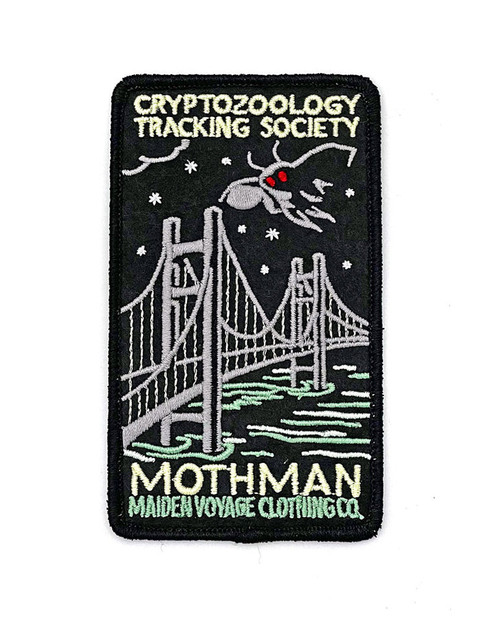 Los parches de Cryptozoology Tracking Society recuerdan a los parches antiguos de los Parques Nacionales, pero cada uno presenta un personaje críptido diferente en su hábitat natural. Este diseño trata sobre el folclore del Hombre Polilla .