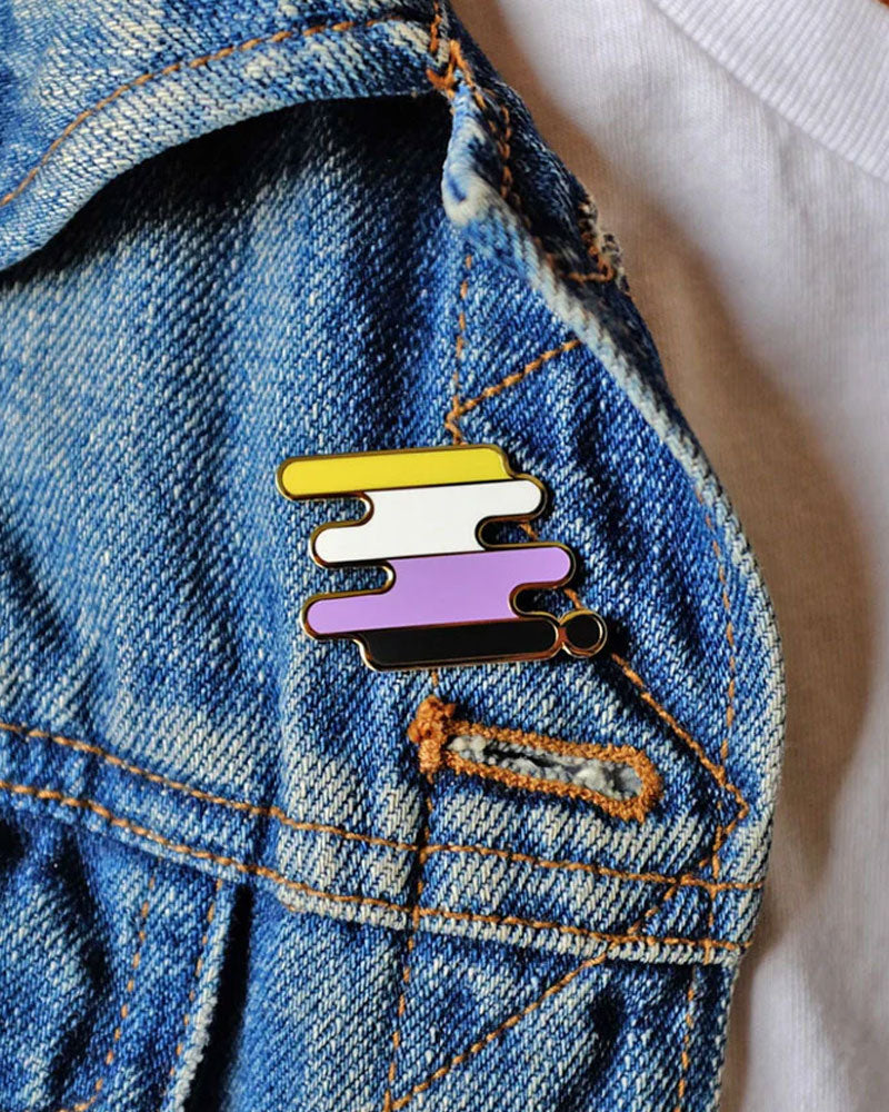 Esta insignia, que es una representación abstracta de los colores de la bandera del orgullo no binario, es una forma sutil de que quienes no se sienten ni hombres ni mujeres se sientan conectados con su ser. Concientiza sobre las identidades que están fuera del binario de género.