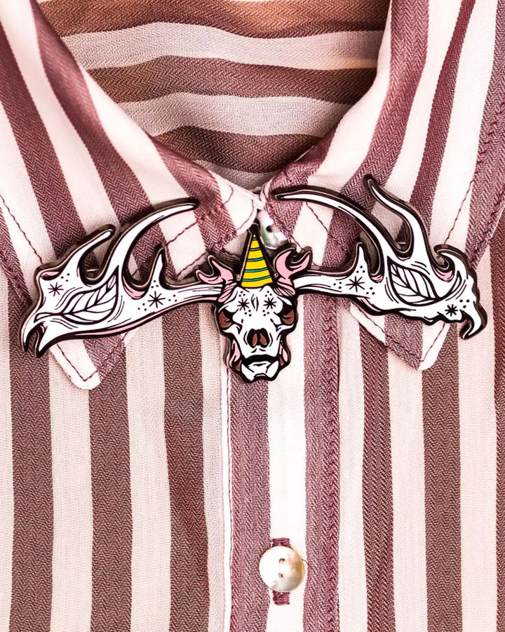 ¡Una calavera de ciervo ilustrada con astas grandes y detalles únicos como hojas, estrellas y un sombrero de fiesta! Este broche de gran tamaño queda genial para una celebración en los extremos de tu cuello, o como broche grande y llamativo en tu bolso o sobre un bolsillo.
