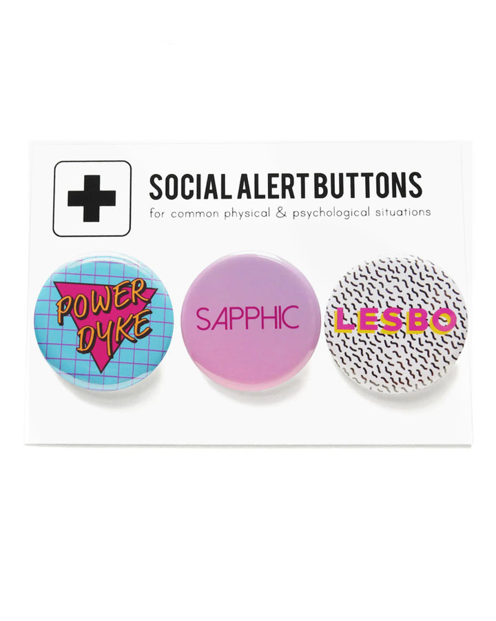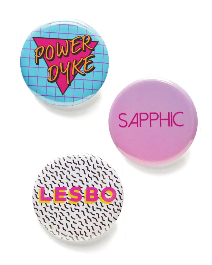 Un trío de botones relacionados con lesbianas: Power Dyke, Sapphic, Lesbo.