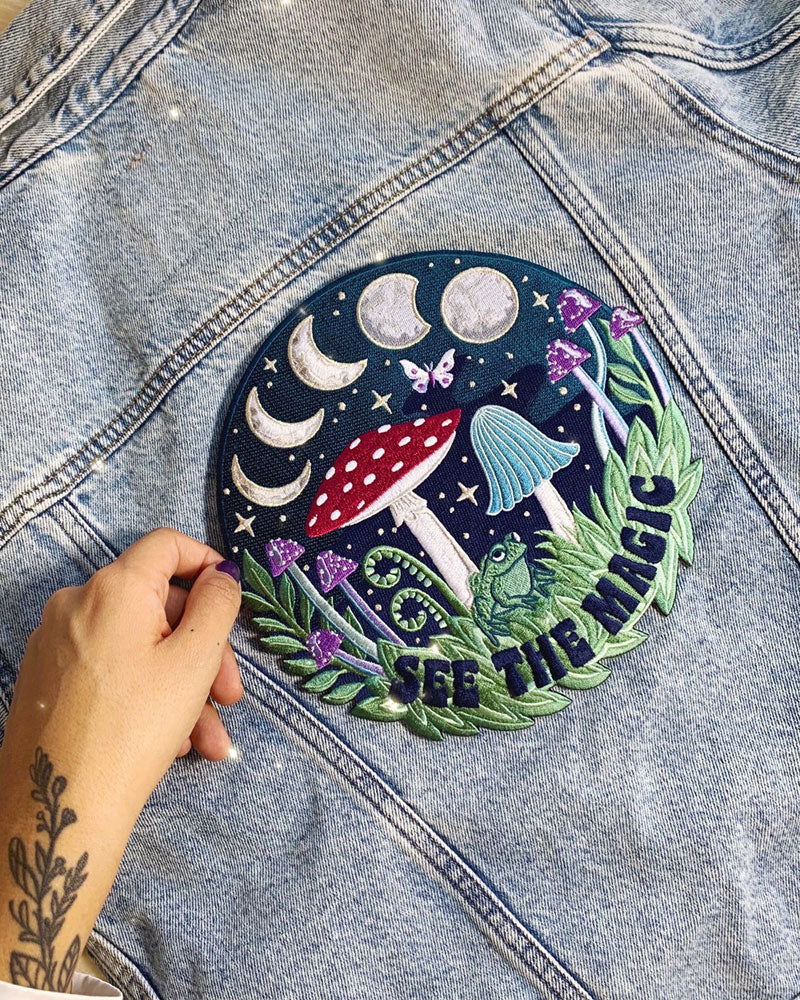 Para los amantes de las plantas y las hadas del estilo cottagecore, este parche para la espalda es ideal para tu guardarropa. Hongos y una rana que todo lo sabe se sientan entre las fases lunares con una mariposa flotando. ¡Mágico!