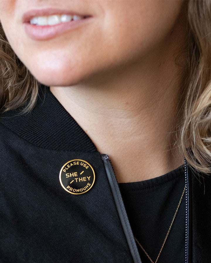 Broche identificador de She/They fácil de leer que se puede usar en la solapa o en cualquier otra zona visible. Permite que la gente sepa cómo prefieres que te llamen, lo que te quitará un poco de incomodidad y presión de encima y, al mismo tiempo, harás una pequeña declaración.