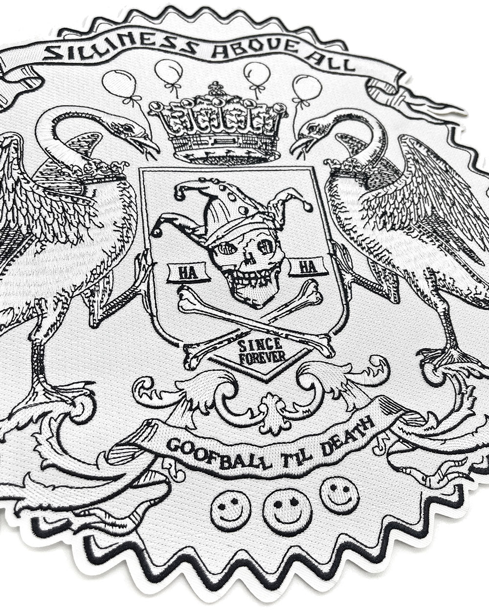El parche perfecto para la espalda para cualquier tonto, bufón o samaritano tonto. El diseño presenta gansos tontos, bufones, caras sonrientes y globos divertidos. Llévalo en tu chaqueta para que la gente sepa que no te tomas la vida demasiado en serio. ¡Haz tonterías hasta la muerte!
