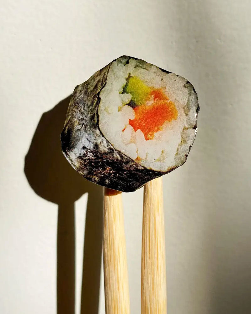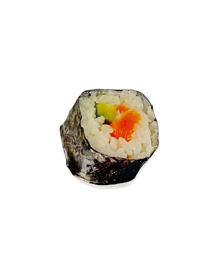 Love sushi? Then you'll love this kitschy, fun pop-culturesque pin. Add some fun food flair to your jacket, hat, or bag with this realistic salmon avocado sushi roll pin.