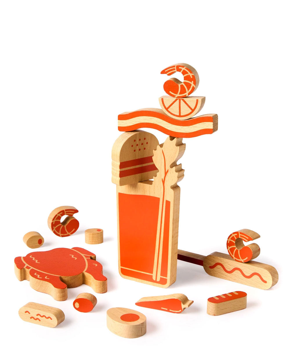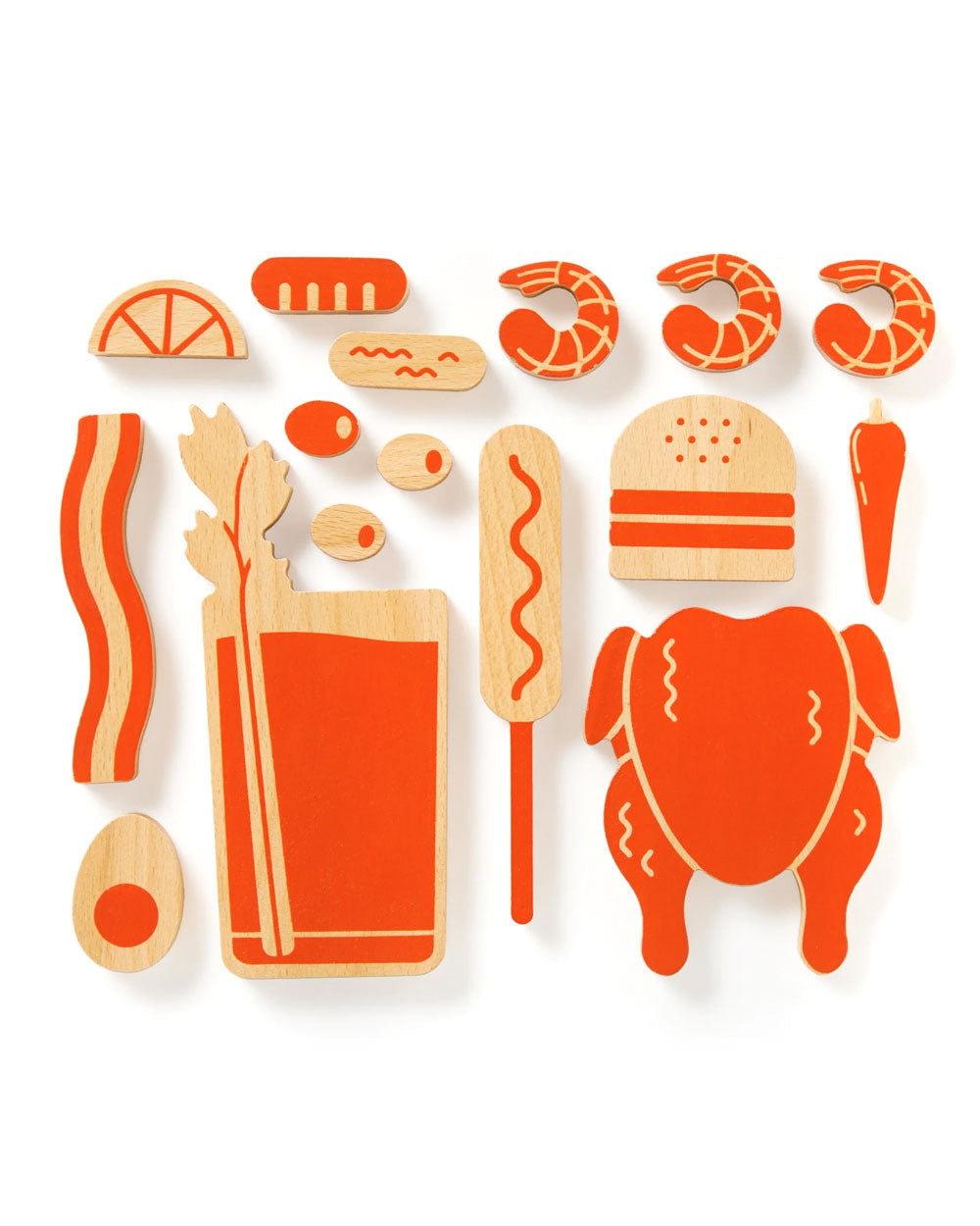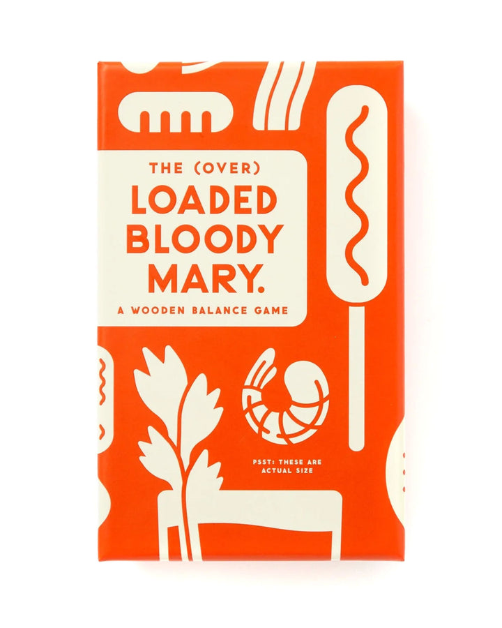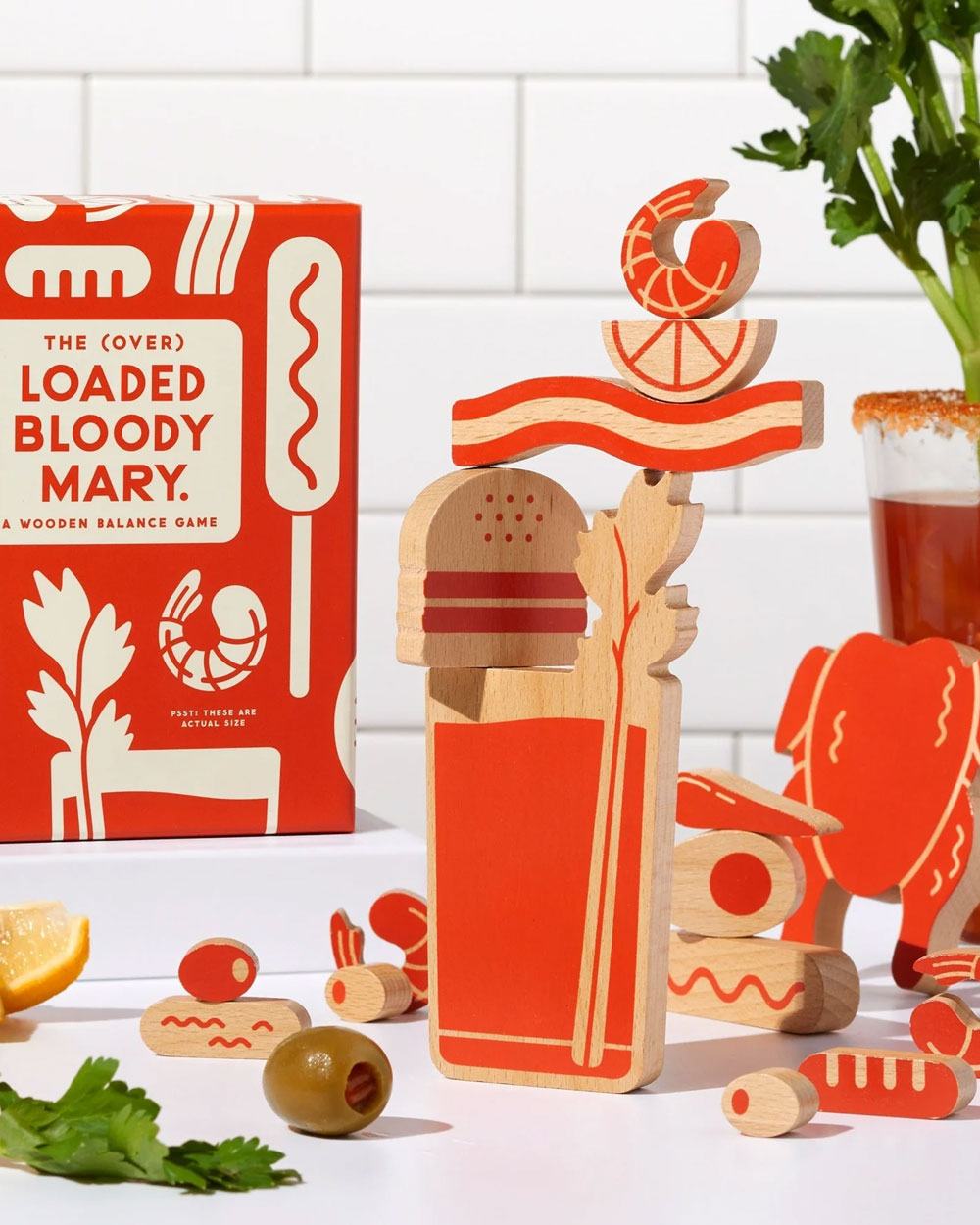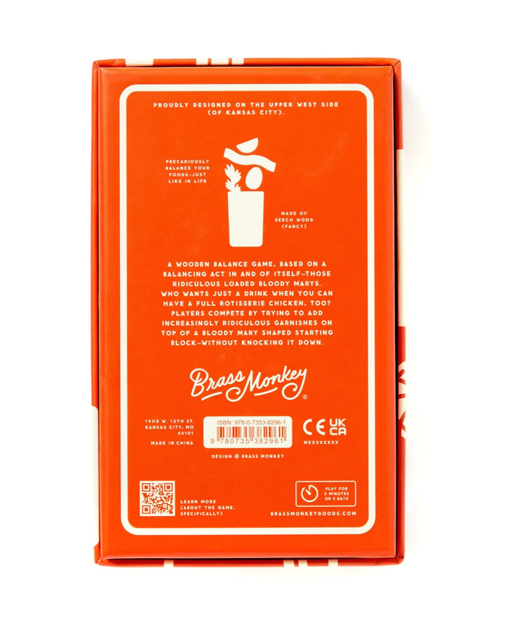 Players complete by taking turns adding increasing ridiculous garnishes on top of a Bloody Mary-shaped starting block as they try not to be the one that knocks it all down.