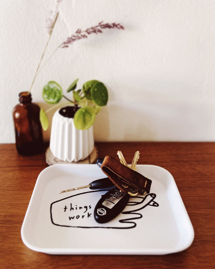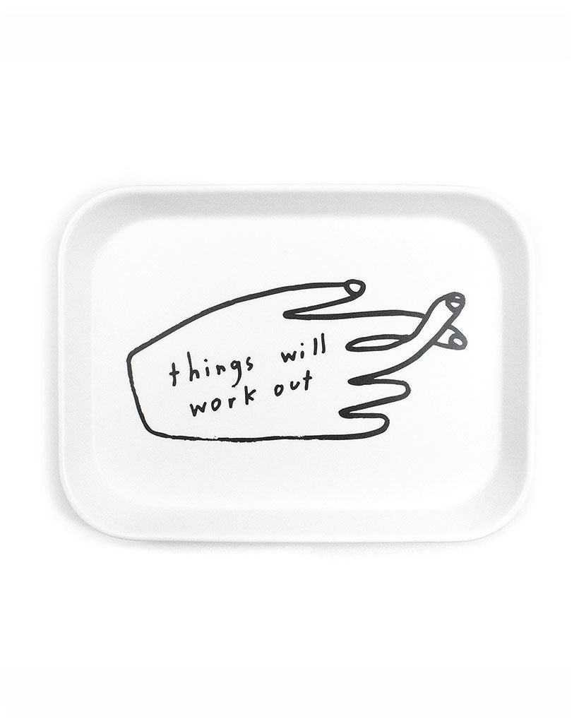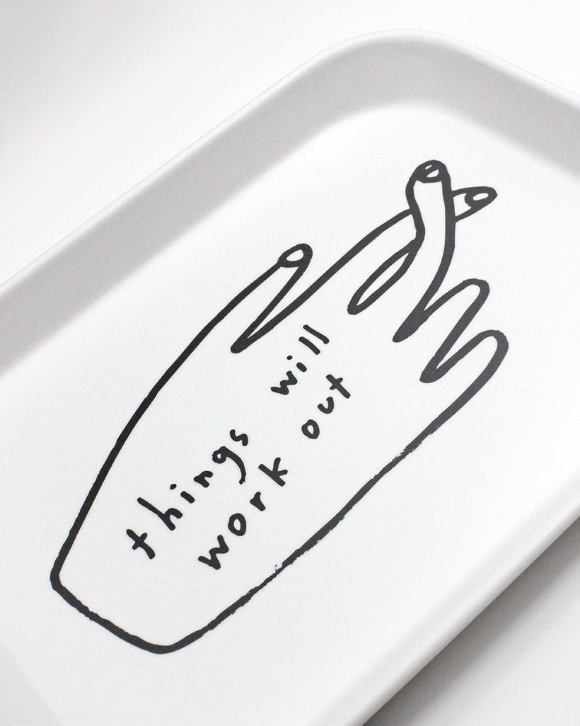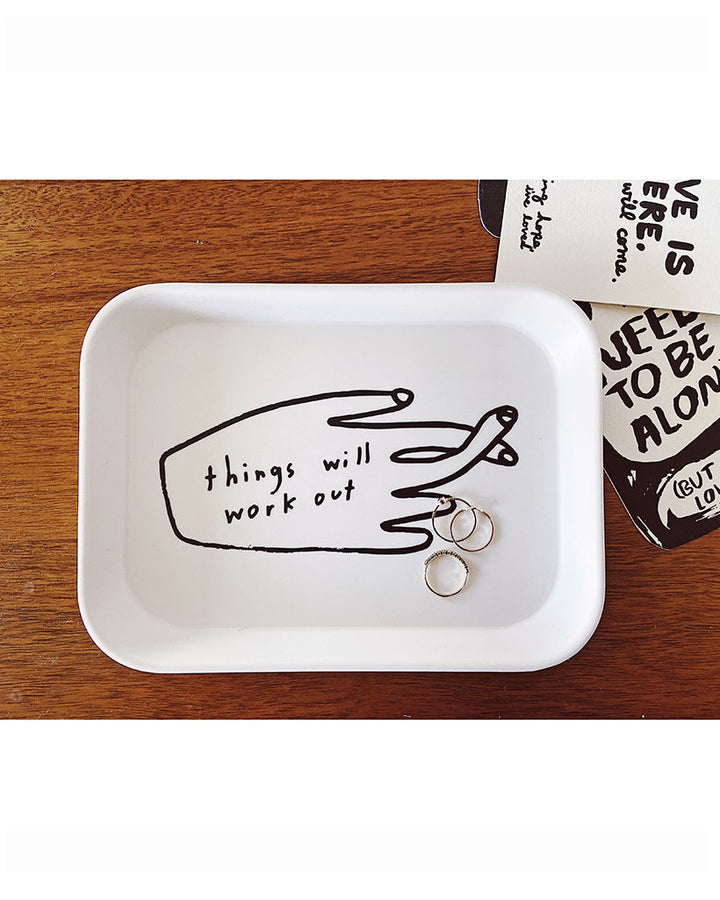 Recuerda que todo saldrá bien si exhibes y guardas tus objetos cotidianos, como llaves, joyas y monedas, en este práctico recipiente para todo tipo de cosas que transmite un mensaje positivo. Es un organizador sencillo, perfecto para escritorios o mesas en la puerta de entrada, y también es una buena bandeja para llevar cosas.