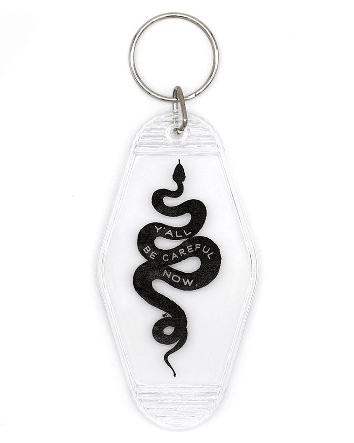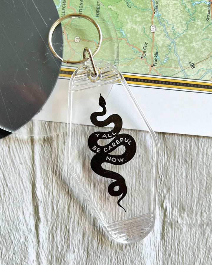 Llavero de estilo vintage con mensaje de advertencia. La lengua de una serpiente golpea algo fuerte.