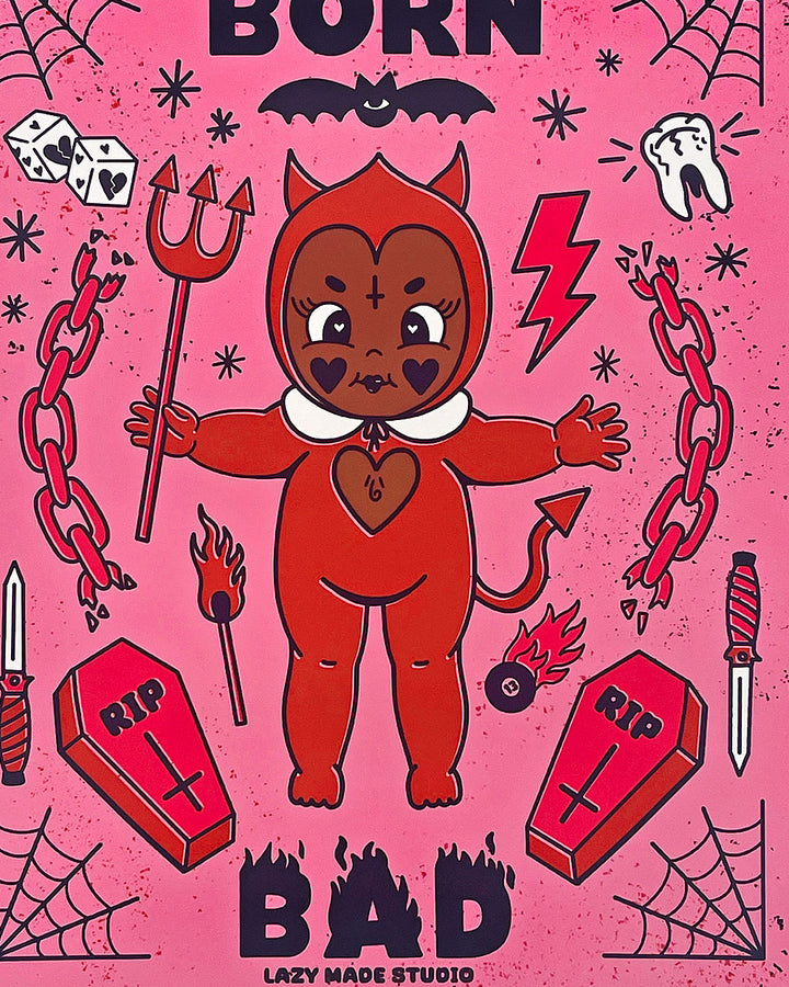 Certaines personnes naissent mauvaises ! Cette poupée Kewpie en costume de diable entourée de cercueils, de couteaux, de toiles d'araignées et de chaînes est si mignonne qu'elle tue.