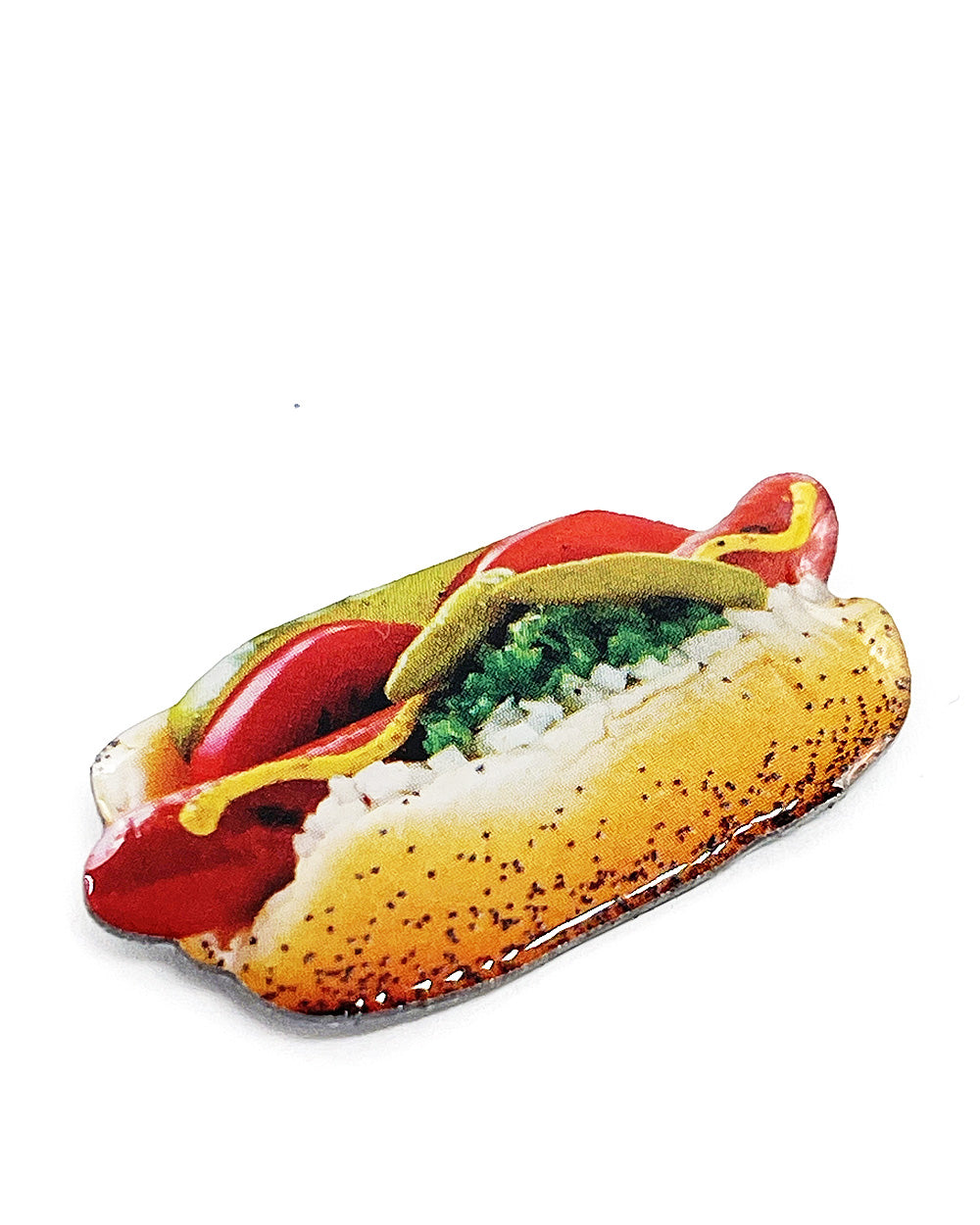 Vous aimez les hot-dogs ? Alors vous allez adorer cette broche pop-culturelle kitsch et amusante. Ajoutez une touche culinaire amusante à votre veste, votre chapeau ou votre sac avec ce chien de Chicago réaliste orné de tomates, de cornichons, d'oignons blancs et de tous les accompagnements.