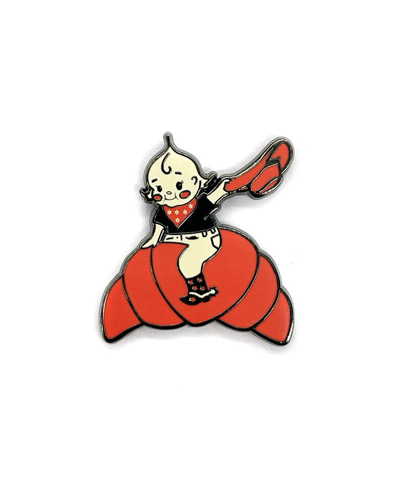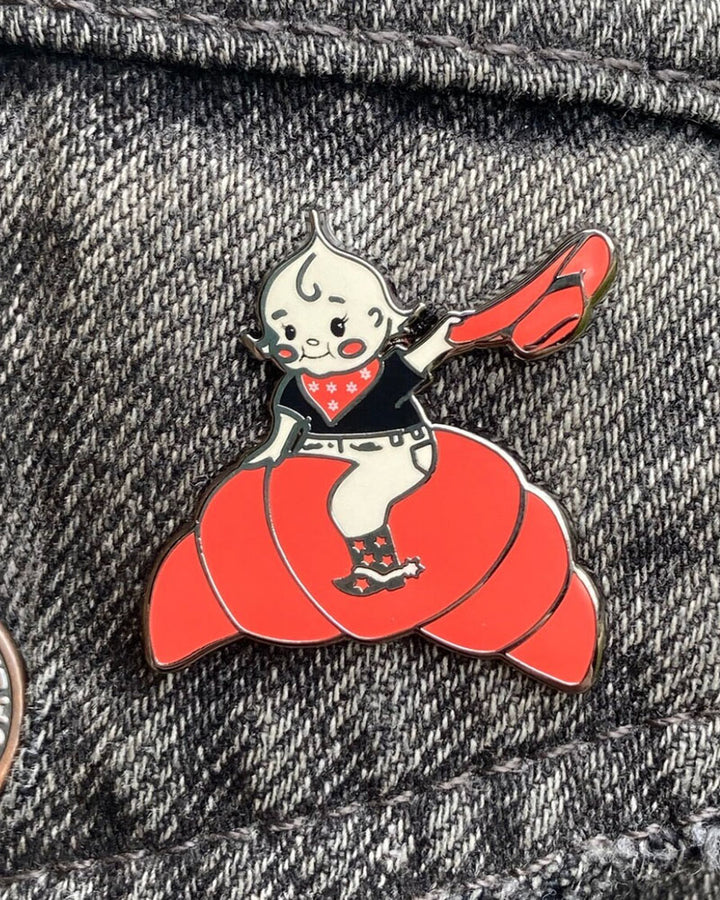 Vous avez déjà eu envie de crier de joie en pensant aux croissants ? Vous avez envie d'attraper au lasso cette friandise feuilletée au beurre à chaque fois que vous en distribuez un dans la nature ? Eh bien, mon garçon, rejoignez cette adorable poupée croissant Kewpie et attachez-la à votre manteau en suivant la vague du revers.