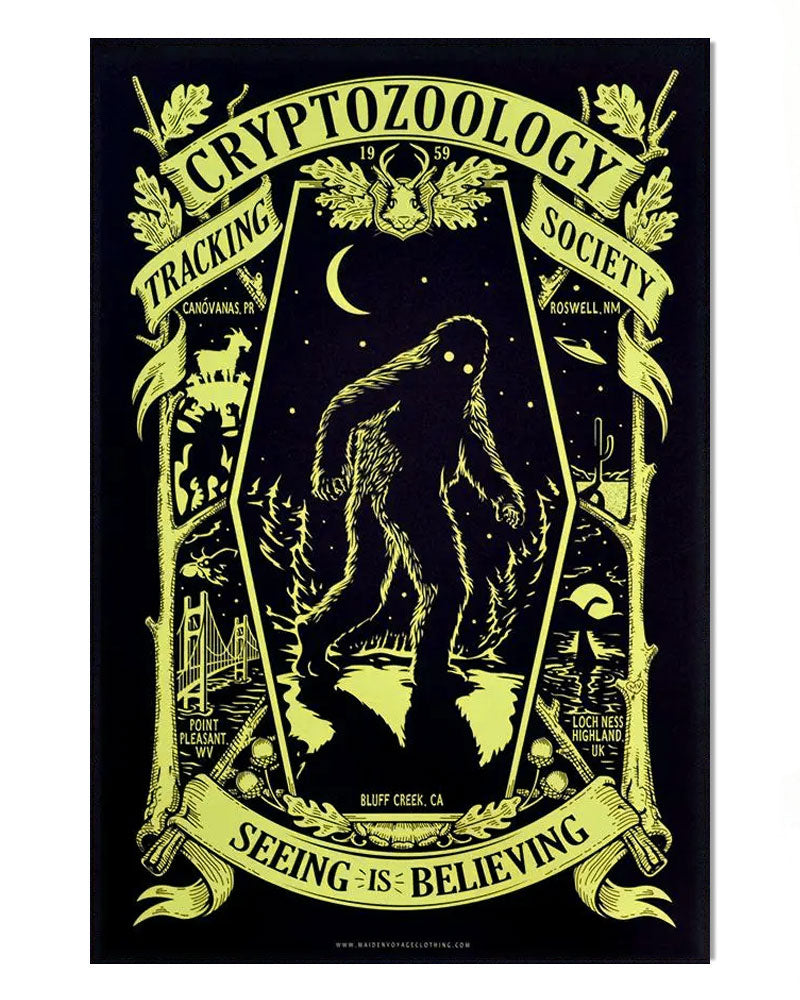 Cryptozoologie signifie littéralement « l'étude des animaux cachés », le terme ayant été publié pour la première fois en 1959 pour décrire l'étude des animaux dont l'existence n'a pas encore été prouvée. En hommage à cette recherche particulière, cette reproduction d'art présente certains des cryptides les plus connus de la cryptozoologie (chacun dans sa propre vignette illustrée), qui sont répertoriés ci-dessous :