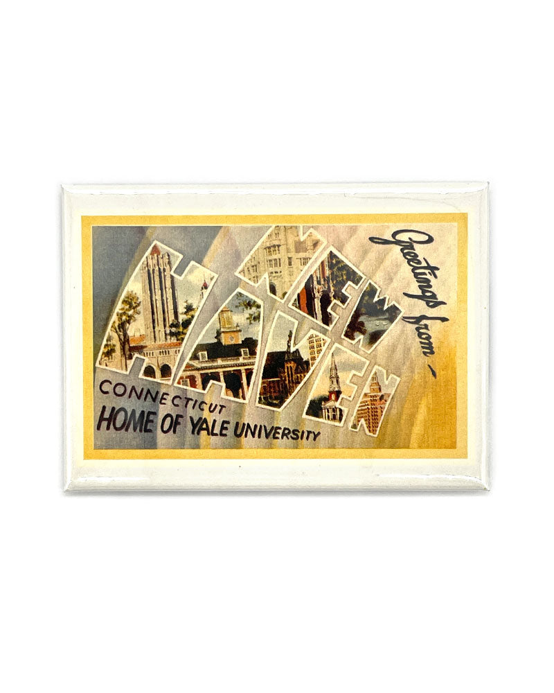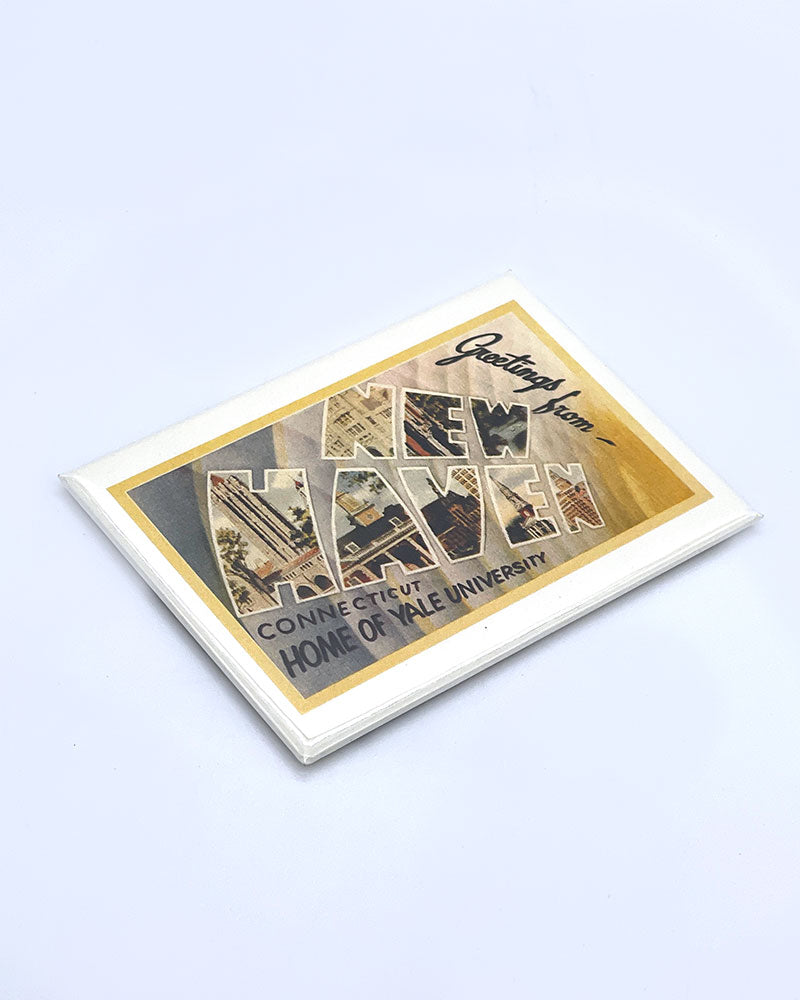 Salutations de New Haven, Connecticut ! Il s'agit d'un aimant de réfrigérateur standard utilisant des images vintage dans un design de style carte postale mettant en valeur l'Université de Yale et l'architecture de la ville. C'est un excellent cadeau pour un habitant local ou un souvenir pour les touristes en visite.