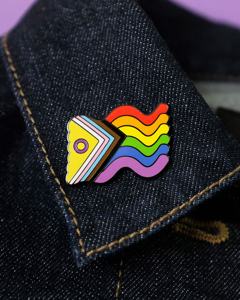Le nouveau drapeau de la fierté intersexuelle et inclusive du progrès créé par Valentino Vecchietti est réalisé dans un style de ligne ondulée . Parfait à porter sur votre revers de veste, et fonctionne également pour tout allié homosexuel.