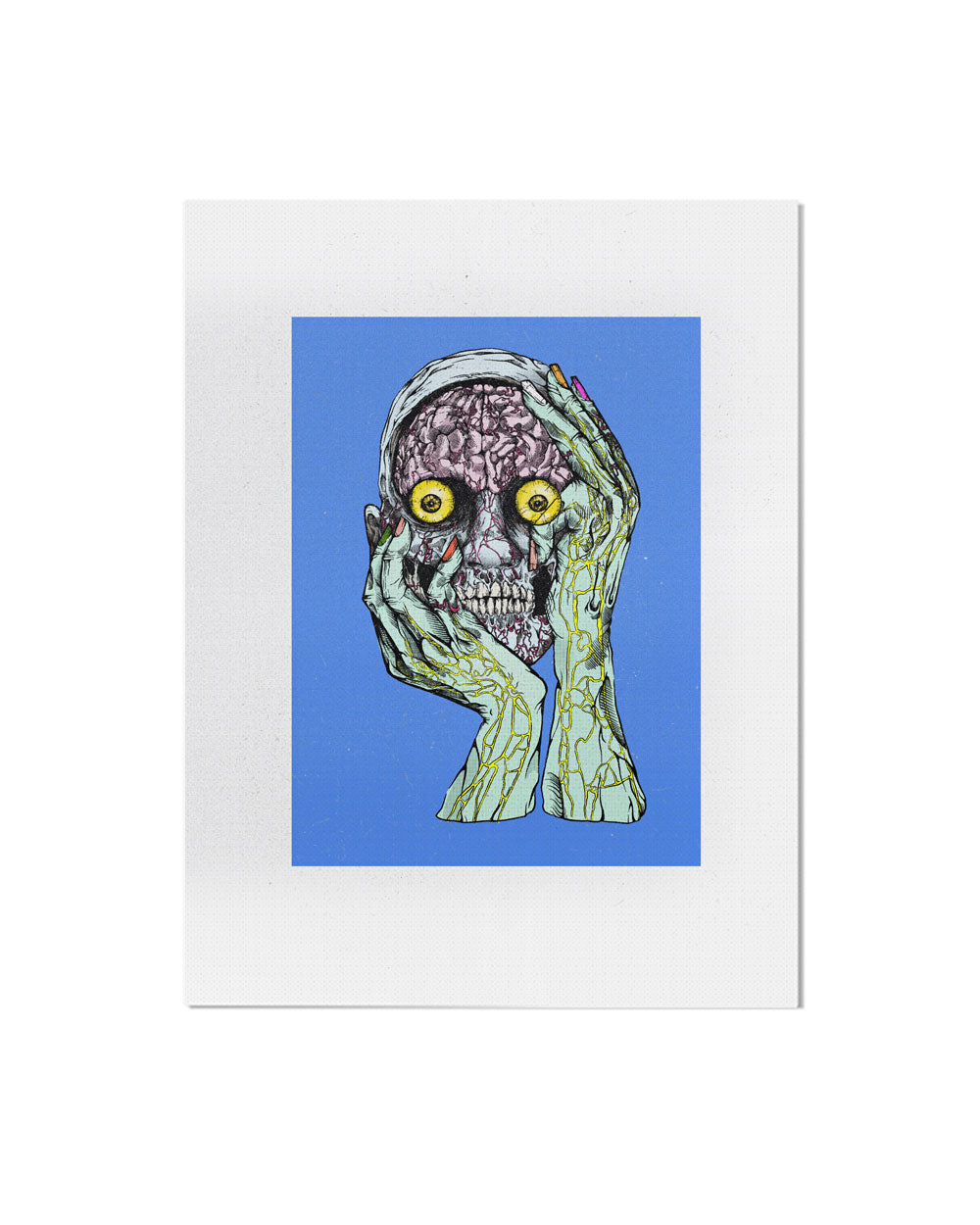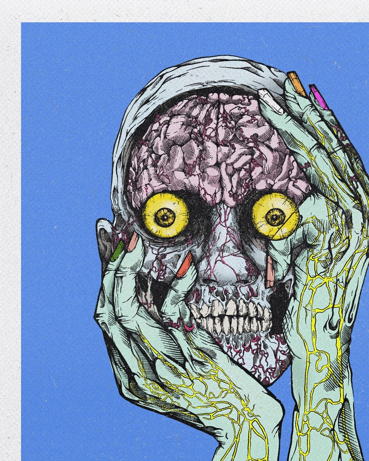 Ever feel stressed??! This detailed, yet vibrant illustration of a human skull embracing their heads and hands is relatable and intriguing... can't stop looking away.