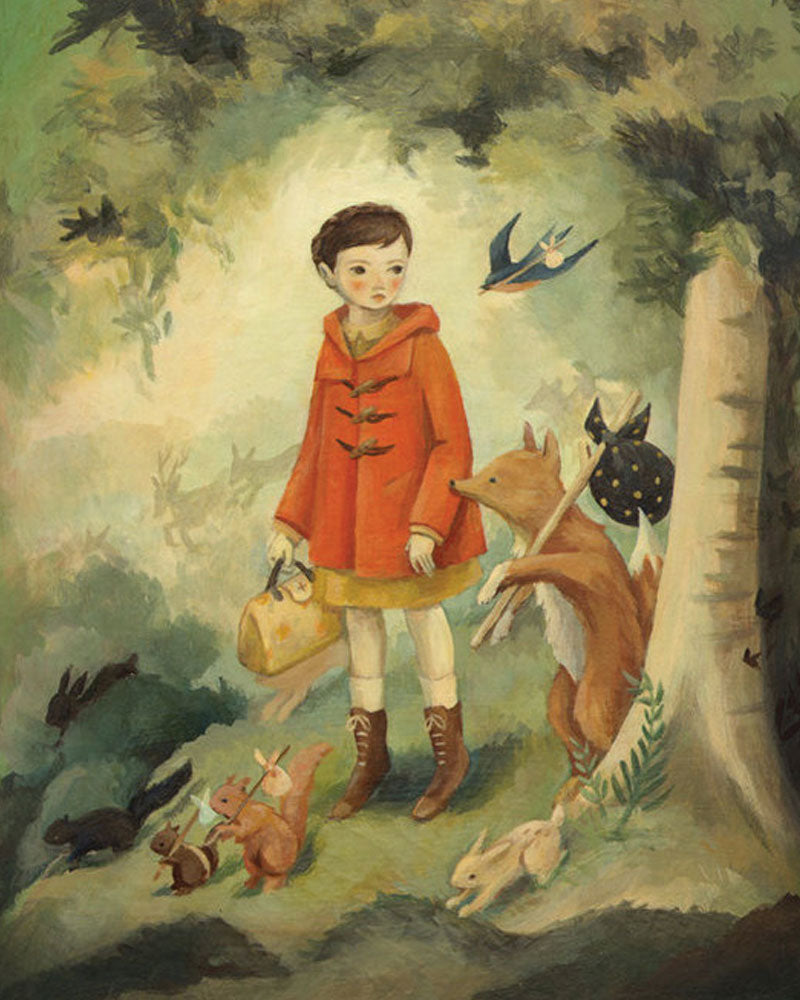 L'artiste dit ceci à propos du portrait : Il existe de nombreuses raisons pour lesquelles la fille et les créatures ont fait leurs valises et sont parties, mais je ne peux imaginer aucune raison suffisamment bonne pour quitter les bois, à moins d'être en grave danger ou en détresse.