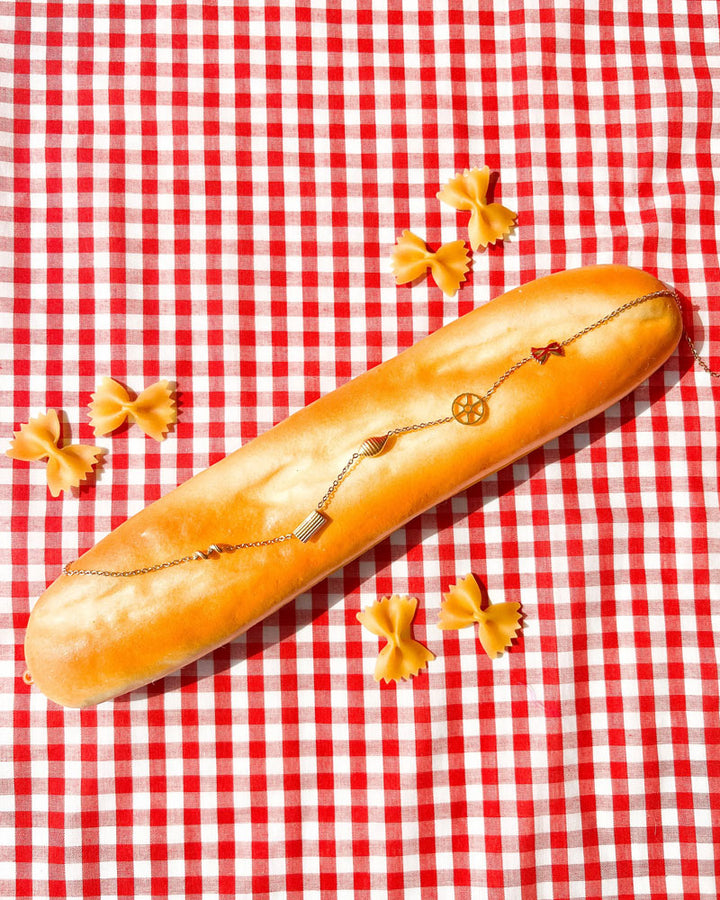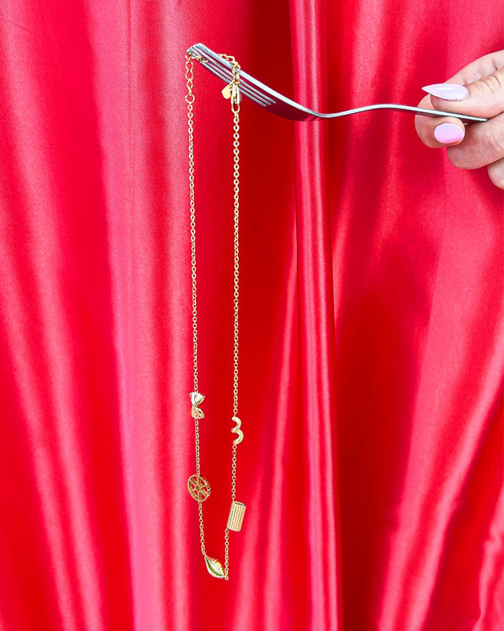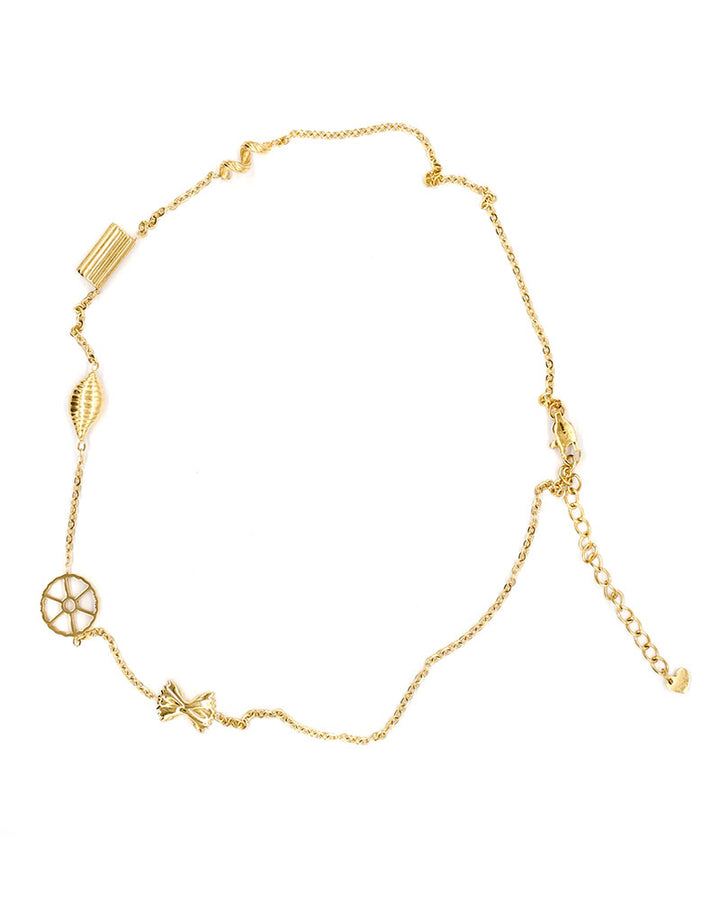 Vous avez envie de pâtes ? Ce collier au style kitsch et pop culture rappelle presque les colliers de macaronis que nous fabriquions quand nous étions enfants.