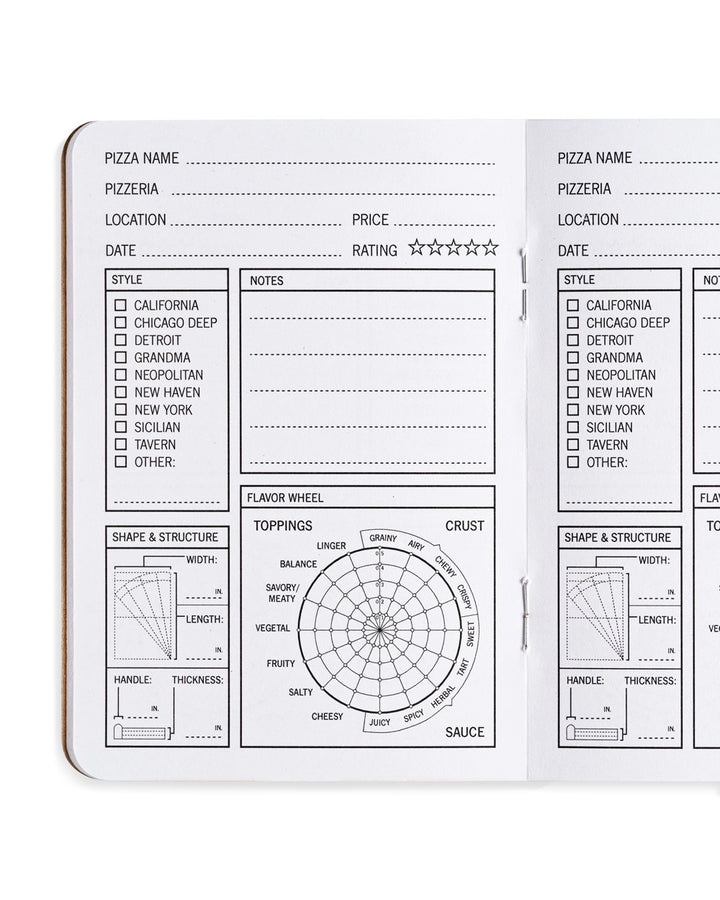 For your enjoyment and review: 33 slices of pizza! This pocket pizza-tasting diary is for all the foodies and pizza aficionados out there. A simple way to mark down notes, reviews, and assessments that's as simple as checking boxes and entering basic info. The trademark flavor wheel makes tasting easy—just connect the dots.