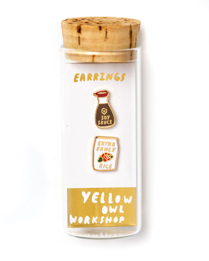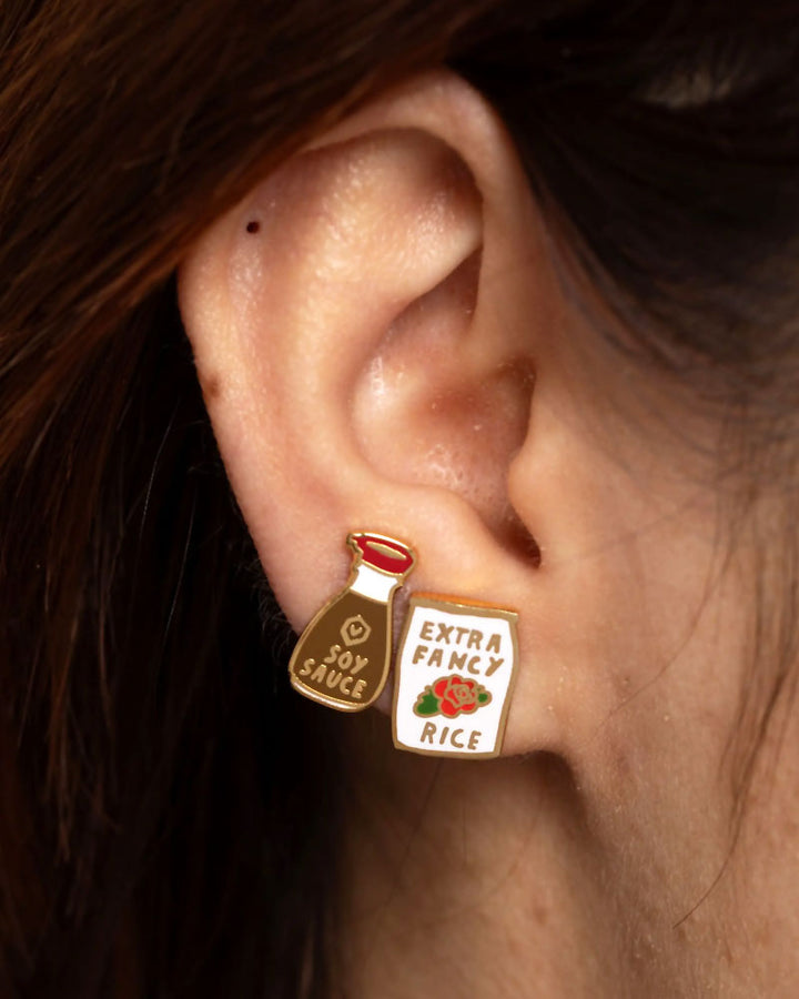 Ces boucles d'oreilles dépareillées sont parfaitement assorties. Des sushis au riz frit, la sauce soja et le riz sont un mariage parfait au Japon.
