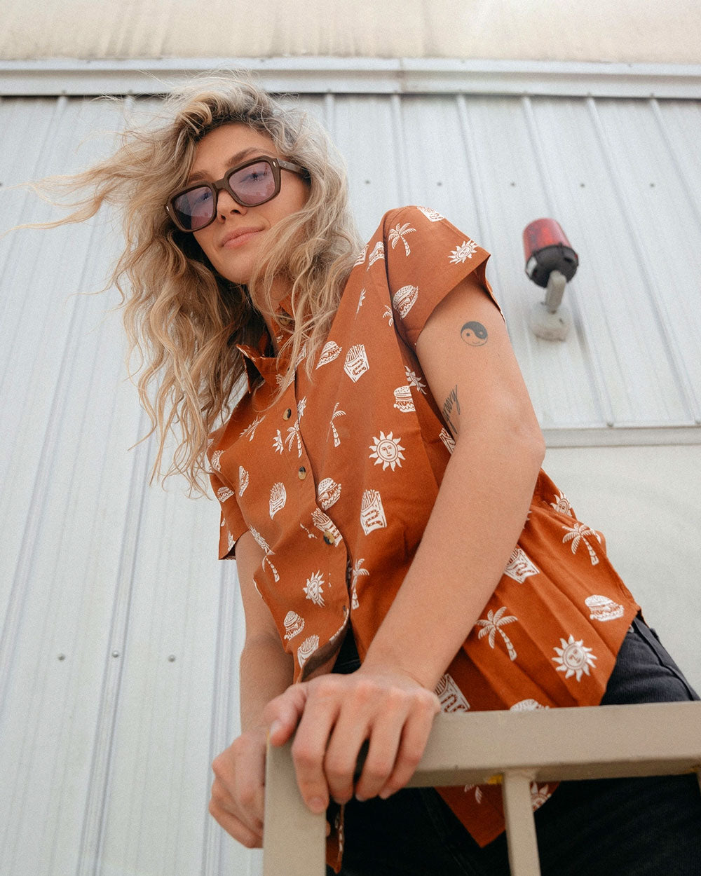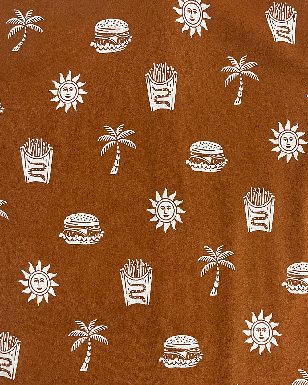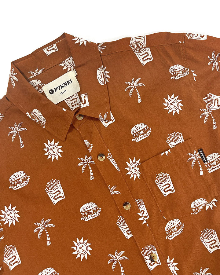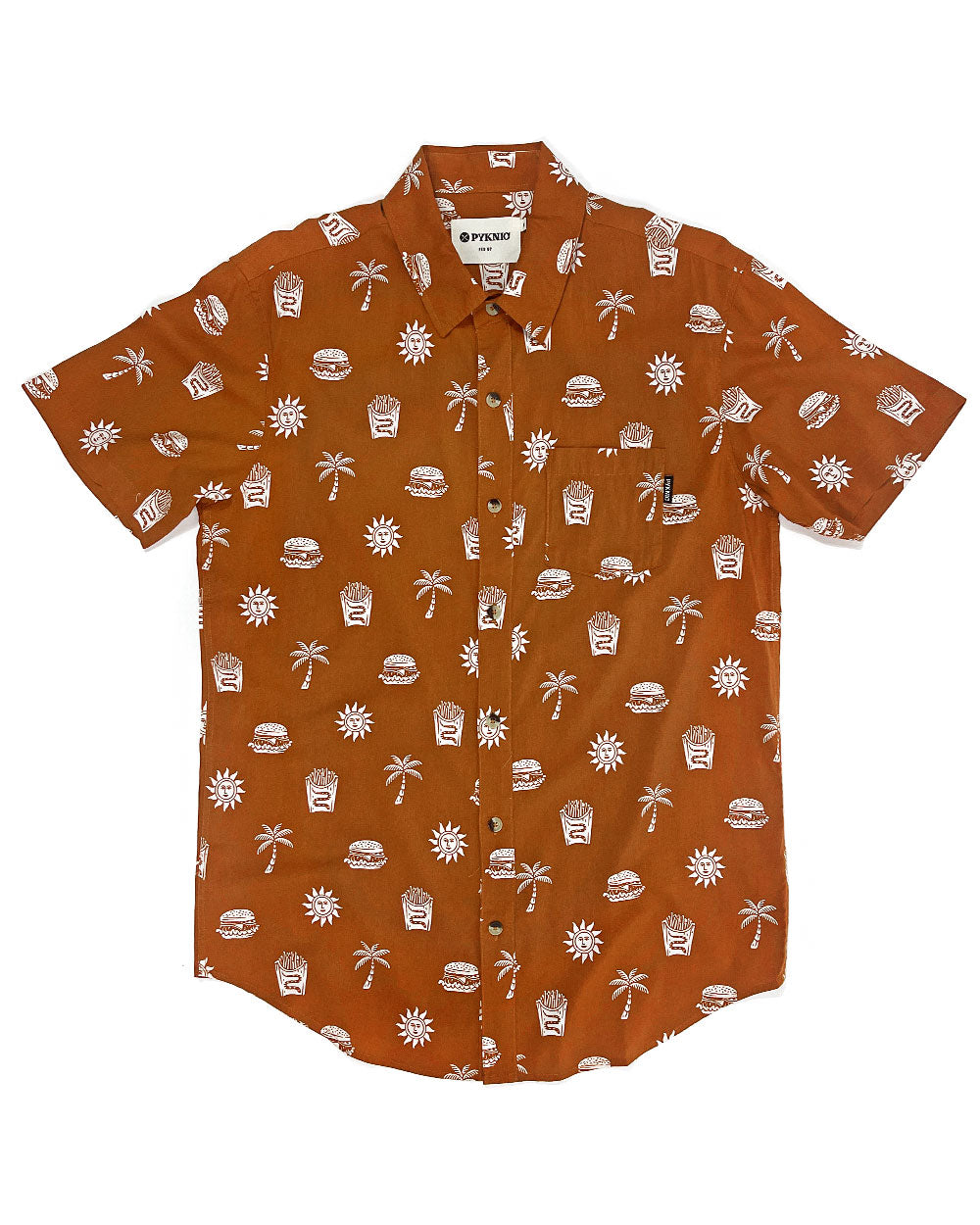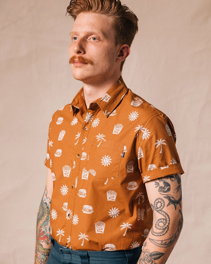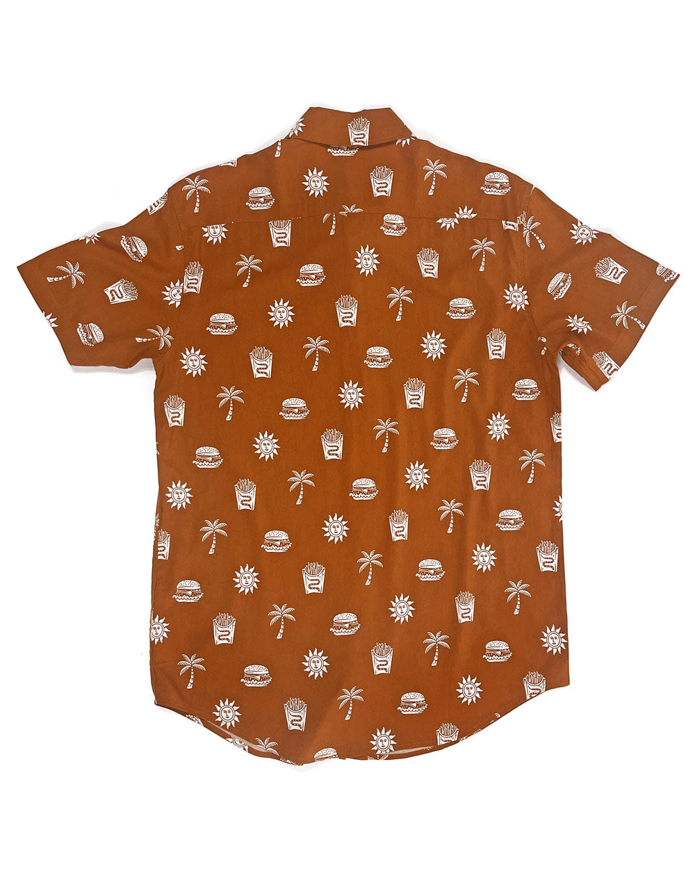 This cut-n-sew button-up shirt looks pretty standard, until you gets up close! The casual shirt features a bold all-over print of cheeseburgers, fries, palm trees, and the sun. Stay sophisticated while not-so-subtly letting everyone know you're all about paradise and a good burger. A perfect shirt for warm weather.