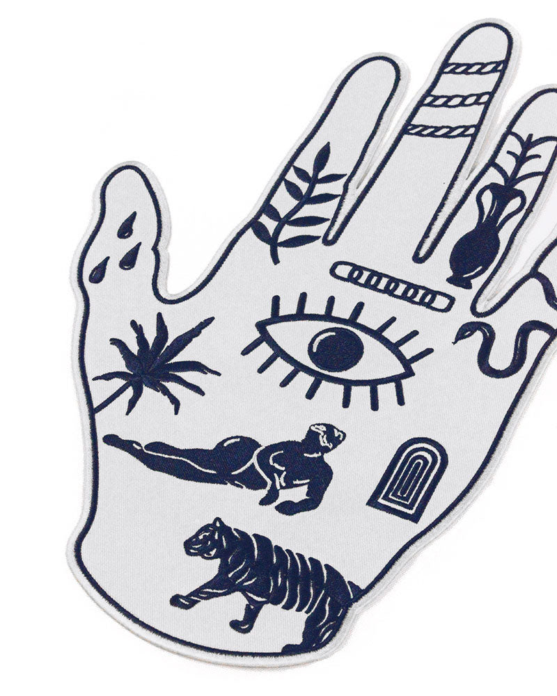 Une main ouverte avec un œil ouvert et d'autres tatouages de phalanges. Attachez cette main à l'arrière de votre veste pour garder un œil derrière vous à tout moment. Éloignez-vous des mauvaises ondes et faites venir les bonnes.