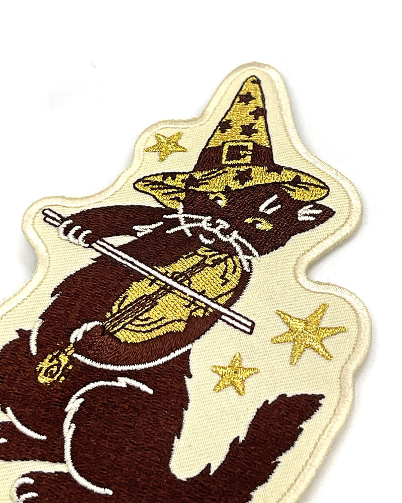 Inspiré des illustrations vintage d'Halloween, ce chat noir porte un chapeau de magicien et joue une chanson magique au violon.