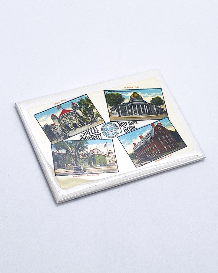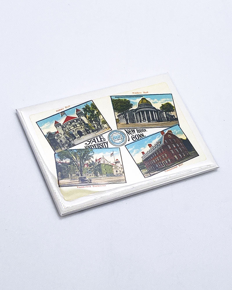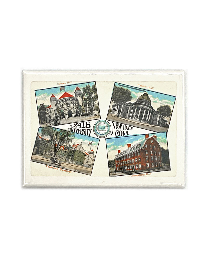 Vues vintage du campus de Yale à New Haven, Connecticut. Il s'agit d'un aimant de réfrigérateur standard utilisant des images rétro dans un design de style carte postale mettant en valeur la fleur de l'État et la capitale de l'État. C'est un excellent cadeau pour un habitant local ou un souvenir pour les touristes en visite.