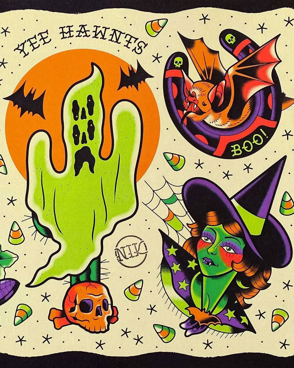 Une impression d'art flash inspirée du tatouage traditionnel. Yee Hawnt, petits fantômes ! Montez en selle et attrapez un nouveau motif digne de votre crypte trippante. C'est un régal merveilleusement diabolique pour toute maison hantée. Idéal pour les cow-boys et les cow-goules.