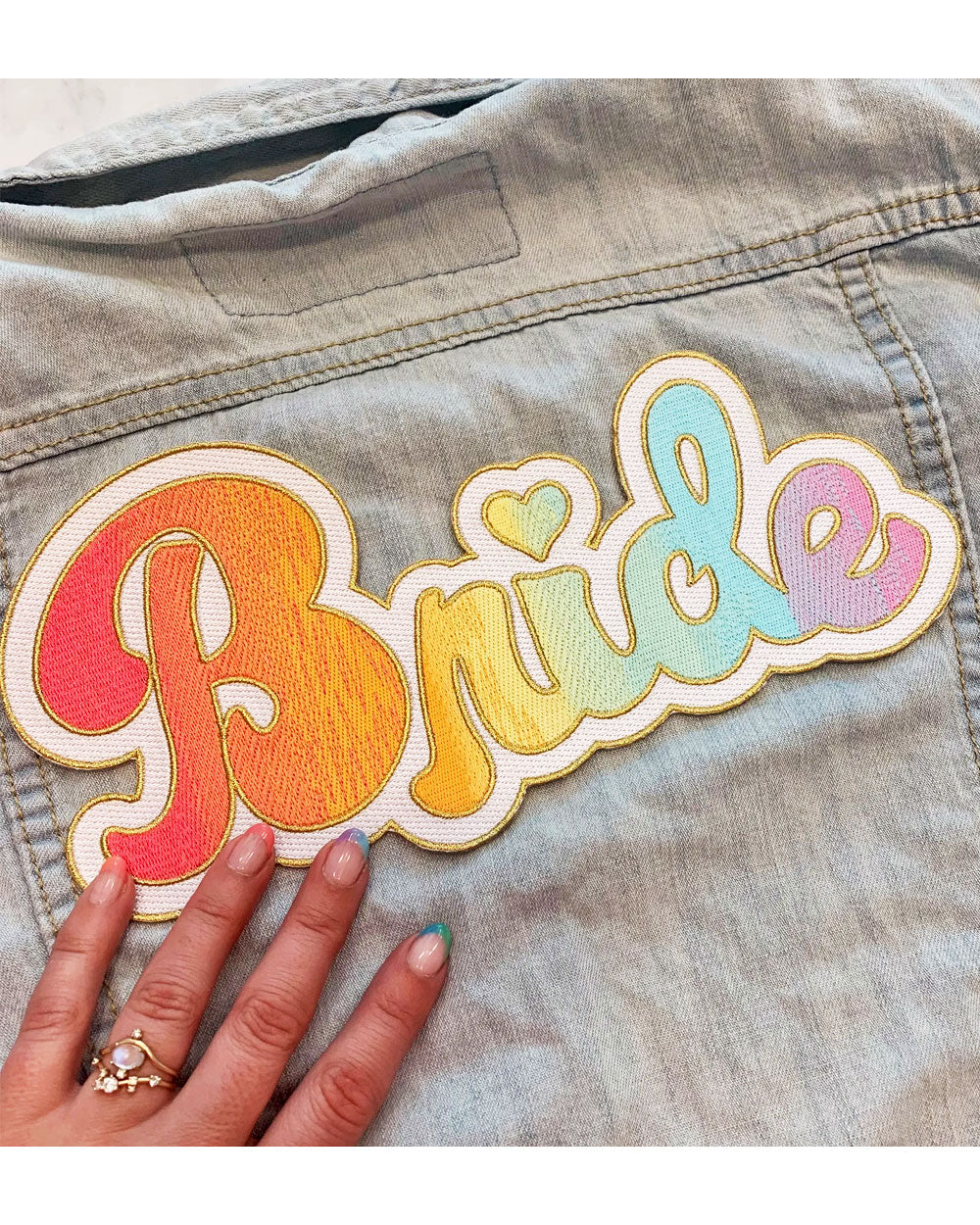 Bridge brigade is here! This large patch makes a great gift ironed onto a jacket for a bride-to-be, bachelorette bar crawl, or honeymoon. The fun bubbly letters feature a dreamy rainbow gradient that can also be used in a lesbian wedding for subtle LGBTQ+ pride.