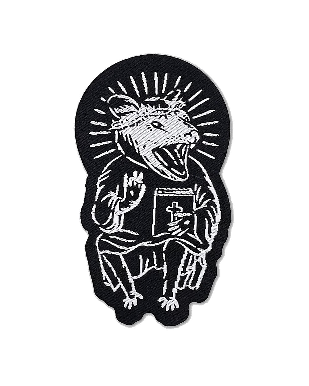 Punch up your favorite denim jacket with this enthusiastic Christian possum. Pair him with the Satanic raccoon for ultimate religious inclusivity.
