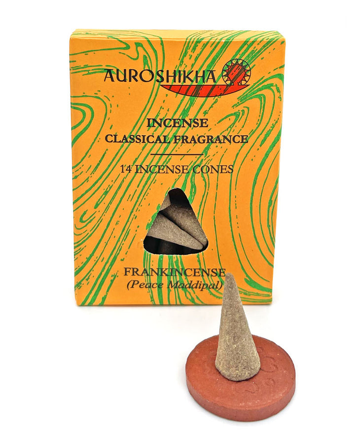 Classical incense cones inspired by nature. This Frankincense scent utilizes pure sandalwood powder with resins of woody frankincense, slightly vanilla gum benzoin, and the balsamic-spicy with conifer-like undertones of olibanum.
