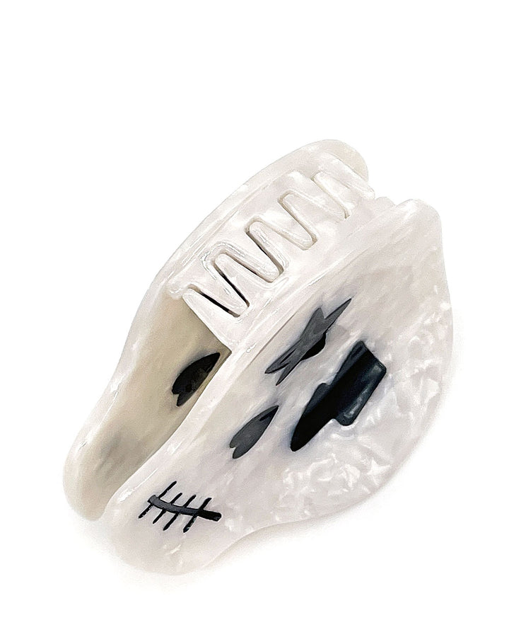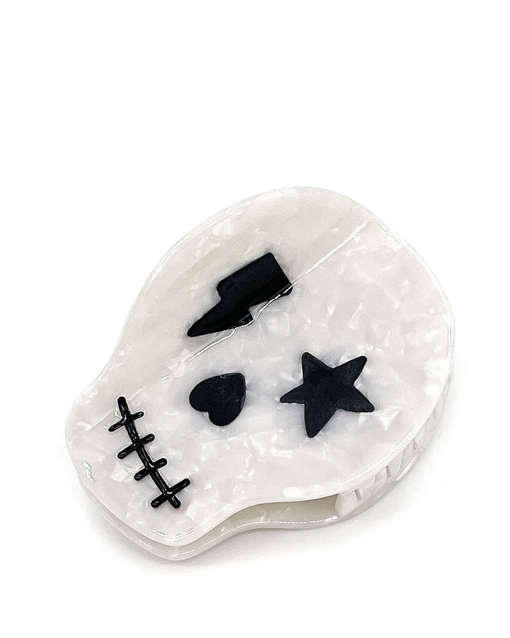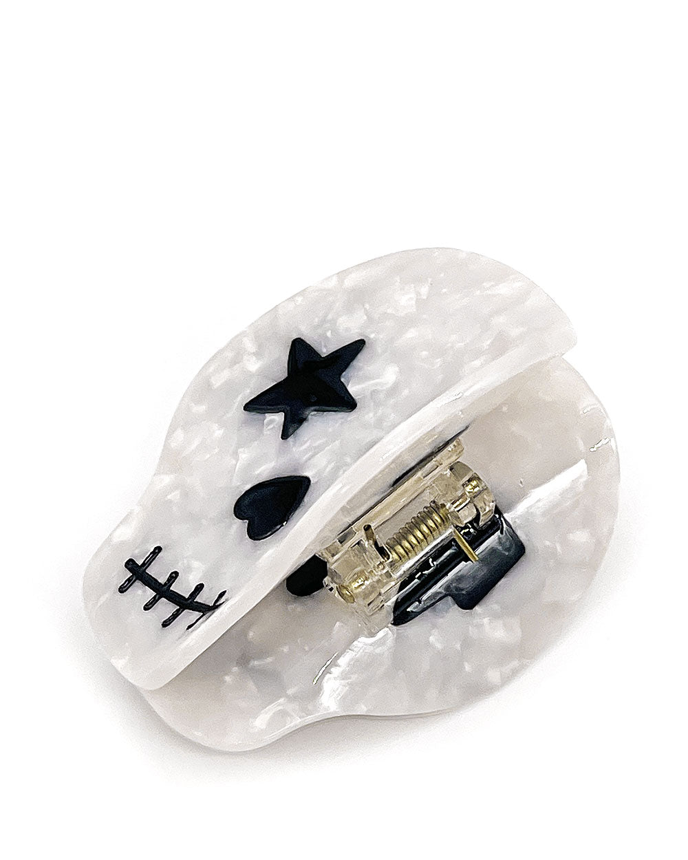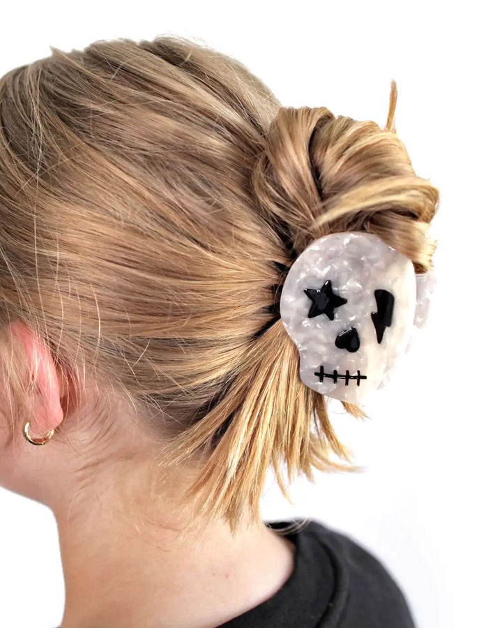 Hair clips are the new scrunchies! The classic skull is given a fun, funky, punk aesthetic with lightning bolt and star eyes, and an upside-down heart nose. Sturdy and stylish, it works for wearing your hair half up if thick, or all up if not.