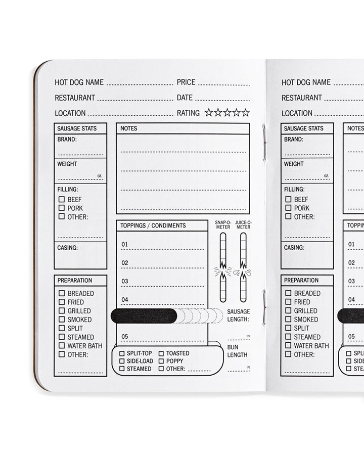For your enjoyment and review: 33 delicious hot dogs! This pocket hot dog-tasting diary is for all the foodies and hot dog aficionados out there. A simple way to mark down notes, reviews, and assessments that's as simple as checking boxes and entering basic info. The trademark flavor wheel makes tasting easy—just connect the dots.