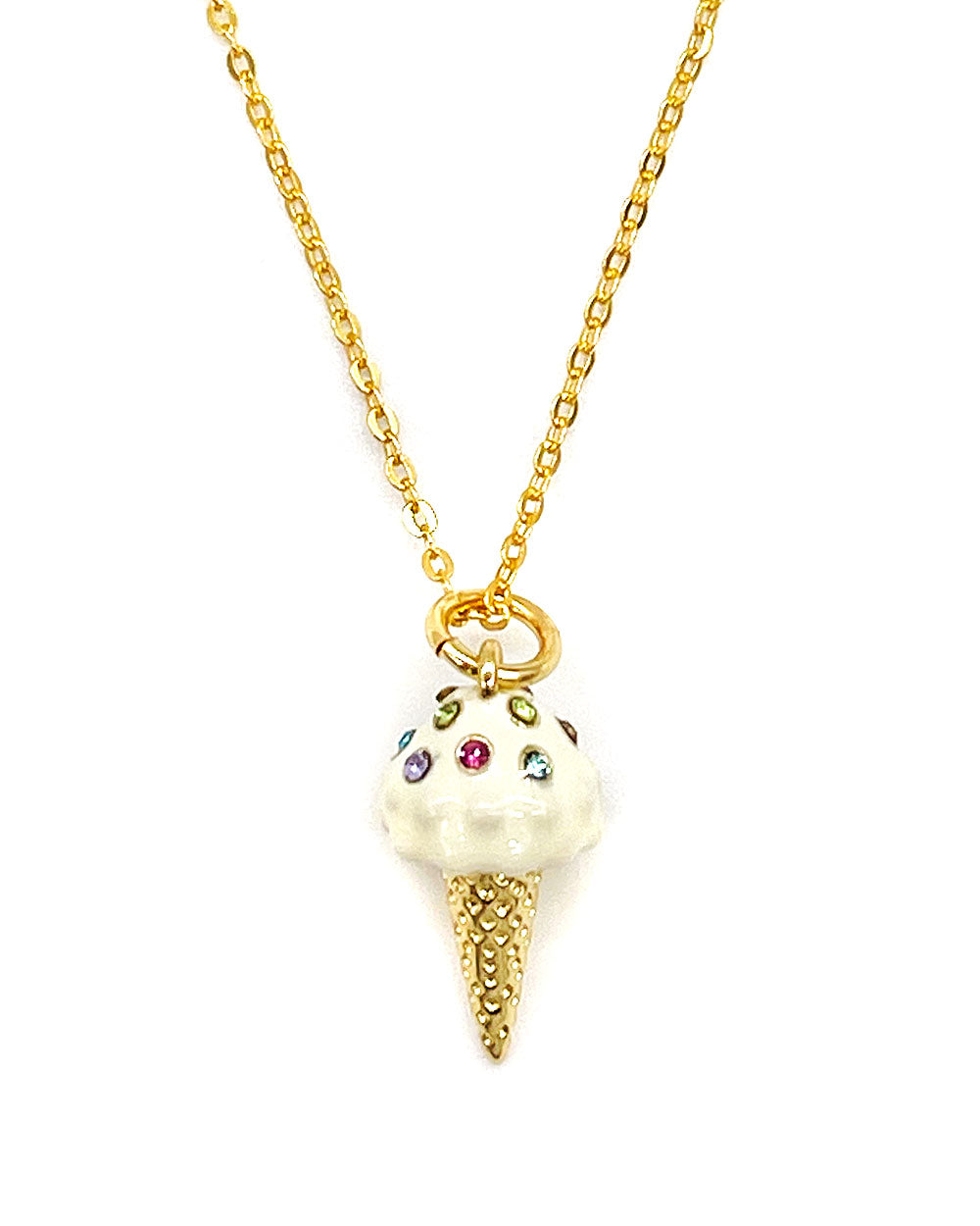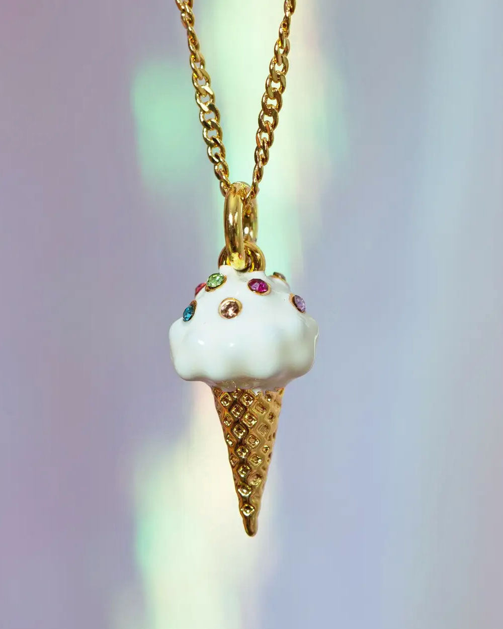 The cutest ice cream cone to dangle around your neck! It features rainbow-colored crystal sprinkles and a waffle cone texture for added detail when looking up close. Take a lick!
