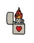 Classic lighter with a red heart and flames shooting our. This little patch is fire! Great for a black leather moto jacket.