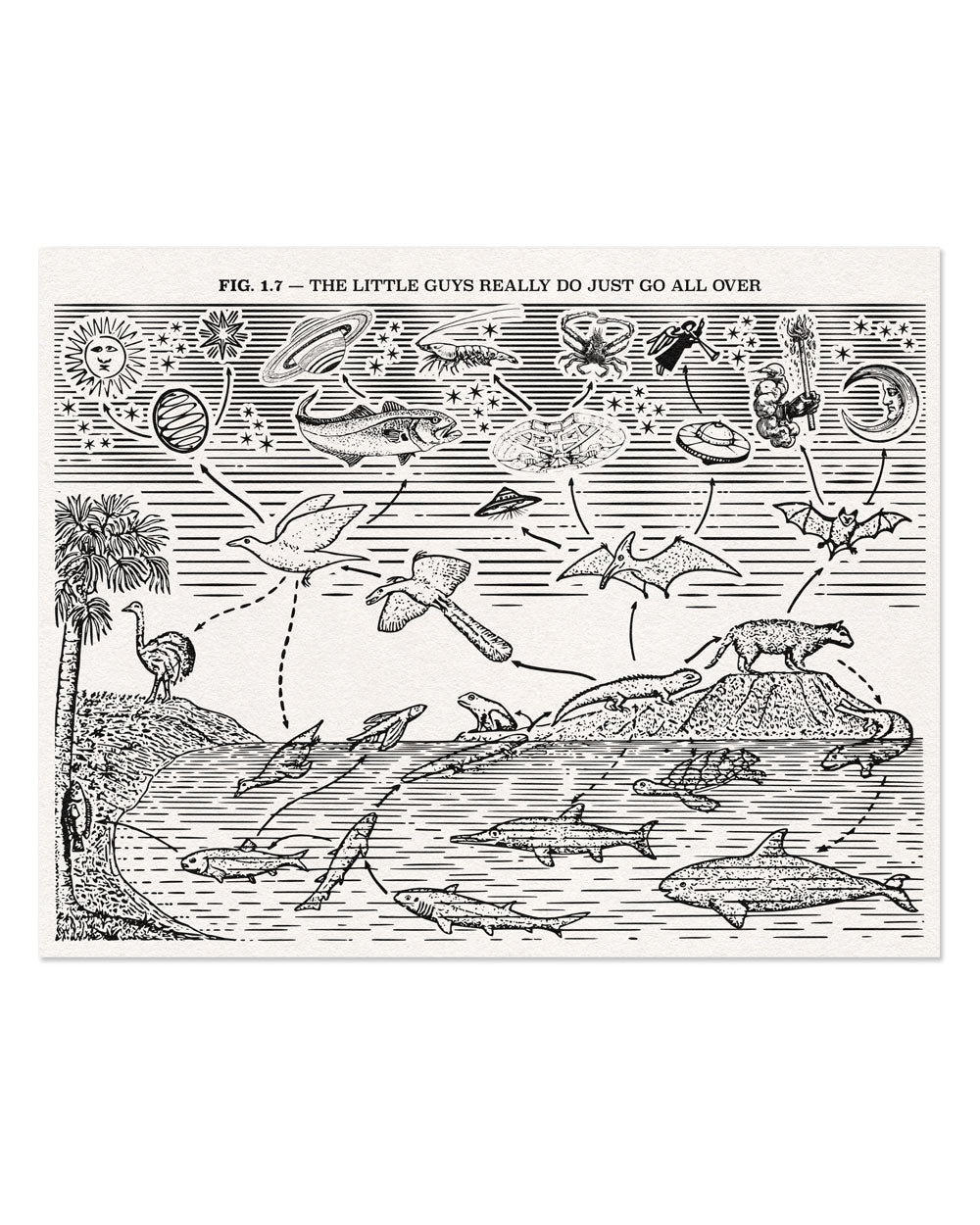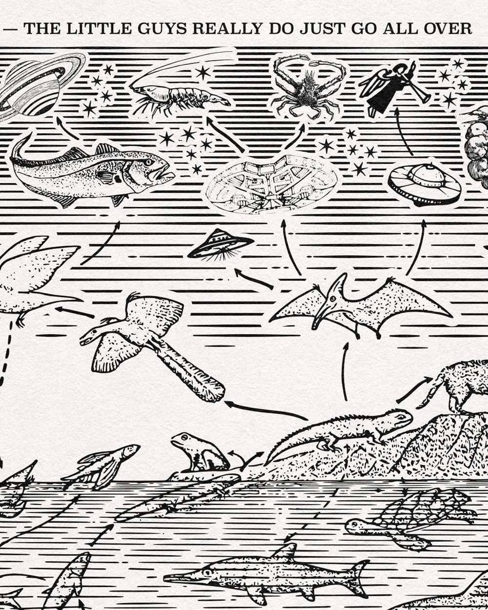 This diagram depicts the wonders of evolution, which is the incredible biological strategy by which all the little guys go all over.